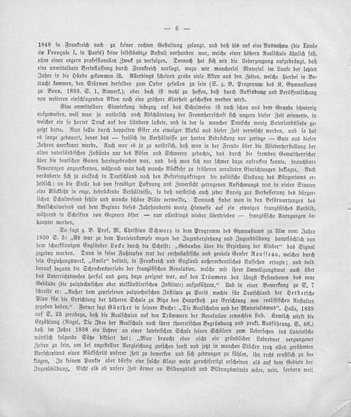 1848 in Frankreich noch zu keiner rechten Geſtaltung gelangt, und daß bis auf eine Ausnahme(die Ecole de François I. in Paris) keine ſelbſtändige Anſtalt vorhanden war, welche einer höhern Realſchule ähnlich ſah, ohne einen engern profeſſionellen Zweck zu verfolgen. Dennoch hat ſich mir die Ueberzeugung aufgedrängt, daß eine unmittelbare Beeinfluſſung durch Frankreich vorliegt, wozu mir mancherlei Material im Laufe der letzten Jahre in die Hände gekommen iſt. Allerdings ſcheinen grade viele Akten aus den Zeiten, welche hierbei in Be⸗ tracht kommen, den Stürmen derſelben zum Opfer gefallen zu ſein(S. z. B. Programm des K. Gymnaſiums zu Bonn. 1893. S. 1. Anmerk.), aber doch iſt wohl zu hoffen, daß durch Auffindung und Veröffentlichung von weiteren einſchlagenden Akten noch eine größere Klarheit geſchaffen werden wird.
