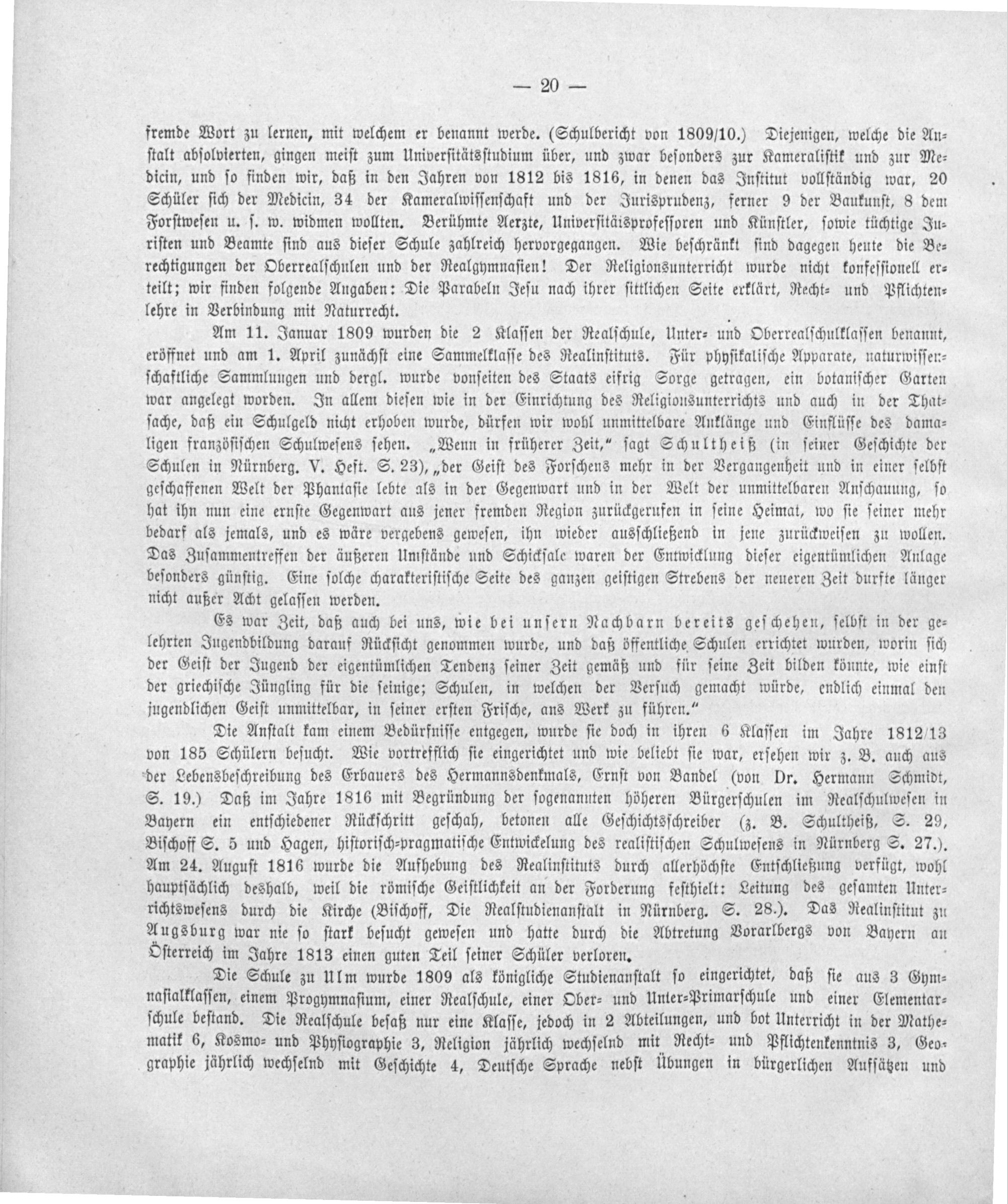 Am 11. Januar 1809 wurden die 2 Klaſſen der Realſchule, Unter⸗ und Oberrealſchulklaſſen benannt, eröffnet und am 1. April zunächſt eine Sammelklaſſe des Realinſtituts. Für phyſikaliſche Apparate, naturwiſſen⸗ ſchaftliche Sammlungen und dergl. wurde vonſeiten des Staats eifrig Sorge getragen, ein botaniſcher Garten war angelegt worden. In allem dieſen wie in der Einrichtung des Religionsunterrichts und auch in der That⸗ ſache, daß ein Schulgeld nicht erhoben wurde, dürfen wir wohl unmittelbare Anklänge und Einflüſſe des dama⸗ ligen franzöſiſchen Schulweſens ſehen.„Wenn in früherer Zeit,“ ſagt Schultheiß(in ſeiner Geſchichte der Schulen in Nürnberg. V. Heft. S. 23),„der Geiſt des Forſchens mehr in der Vergangenheit und in einer ſelbſt geſchaffenen Welt der Phantaſie lebte als in der Gegenwart und in der Welt der unmittelbaren Anſchauung, ſo hat ihn nun eine ernſte Gegenwart aus jener fremden Region zurückgerufen in ſeine Heimat, wo ſie ſeiner mehr bedarf als jemals, und es wäre vergebens geweſen, ihn wieder ausſchließend in jene zurückweiſen zu wollen. Das Zuſammentreffen der äußeren Umſtände und Schickſale waren der Entwicklung dieſer eigentümlichen Anlage beſonders günſtig. Eine ſolche charakteriſtiſche Seite des ganzen geiſtigen Strebens der neueren Zeit durfte länger nicht außer Acht gelaſſen werden.