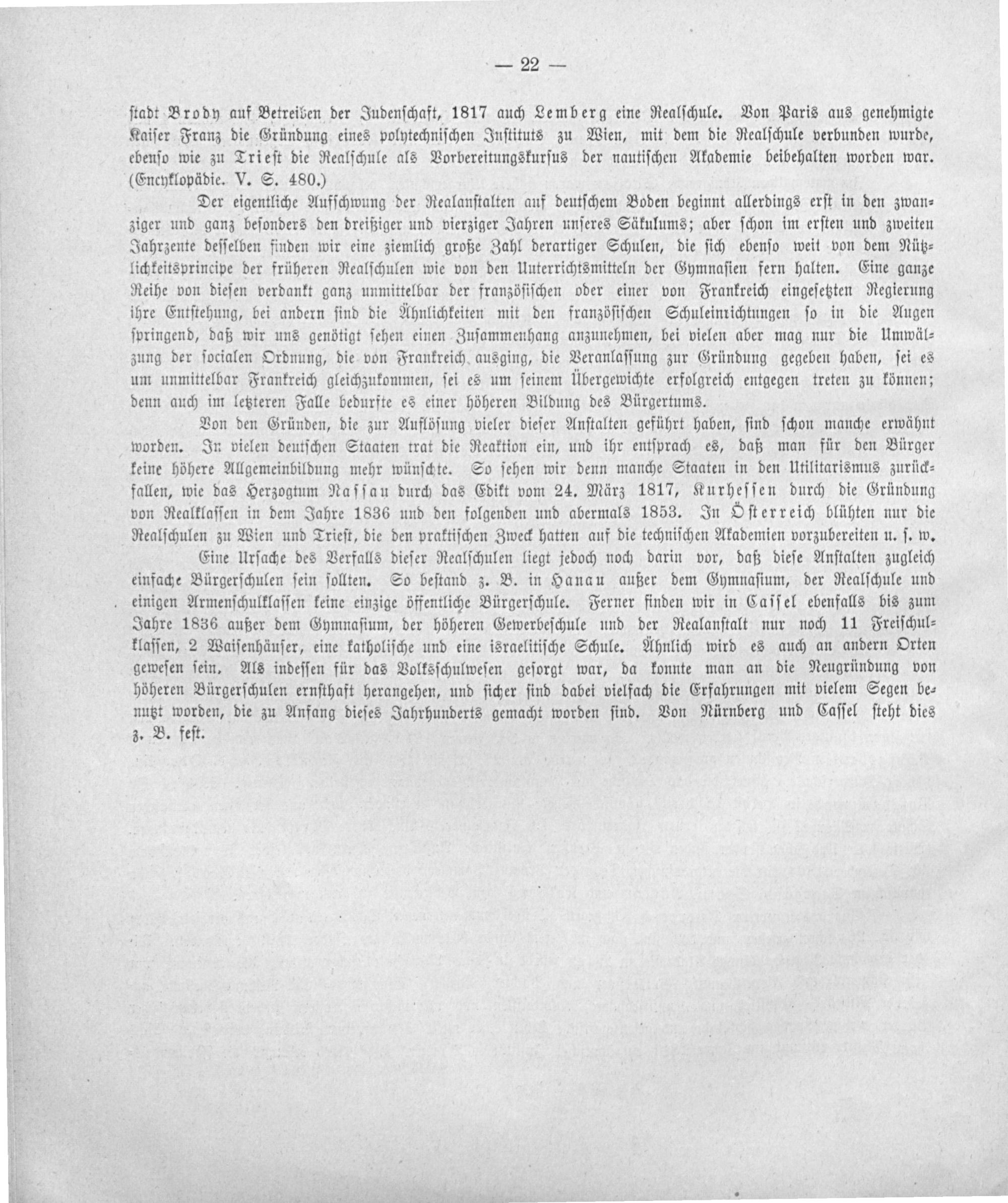 Von den Gründen, die zur Auflöſung vieler dieſer Anſtalten geführt haben, ſind ſchon manche erwähnt worden. In vielen deutſchen Staaten trat die Reaktion ein, und ihr entſprach es, daß man für den Bürger keine höhere Allgemeinbildung mehr wünſchte. So ſehen wir denn manche Staaten in den Utilitarismus zurück⸗ fallen, wie das Herzogtum Naſſau durch das Edikt vom 24. März 1817, Kurheſſen durch die Gründung von Realklaſſen in dem Jahre 1836 und den folgenden und abermals 1853. In Oſterreich blühten nur die Realſchulen zu Wien und Trieſt, die den praktiſchen Zweck hatten auf die techniſchen Akademien vorzubereiten u. ſ. w.