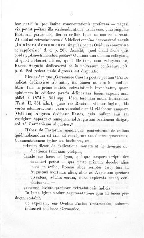 Riesius denique„Germanico Caesari poëtae poetam“ Fastos indicat dedicavisse ab initio, ita tamen ut cum in omnibus libris tum in primo indicia retractationis inveniantur, quam opinionem in editione paucis delineatam fusius exponit ann. philol. a. 1874 p. 561 sqq. Idem fere iam antea Burmannus (Trist. II. 551 adn.), quae res Riesium videtur fugisse, his verbis adumbraverat:„non verosimile mihi videbatur umquam [Ovidium] Augusto dedicasse Fastos, quia nullum eius rei vestigium apparet et numquam ad Augustum orationem dirigat, sed ad Germanicum aliquoties.“