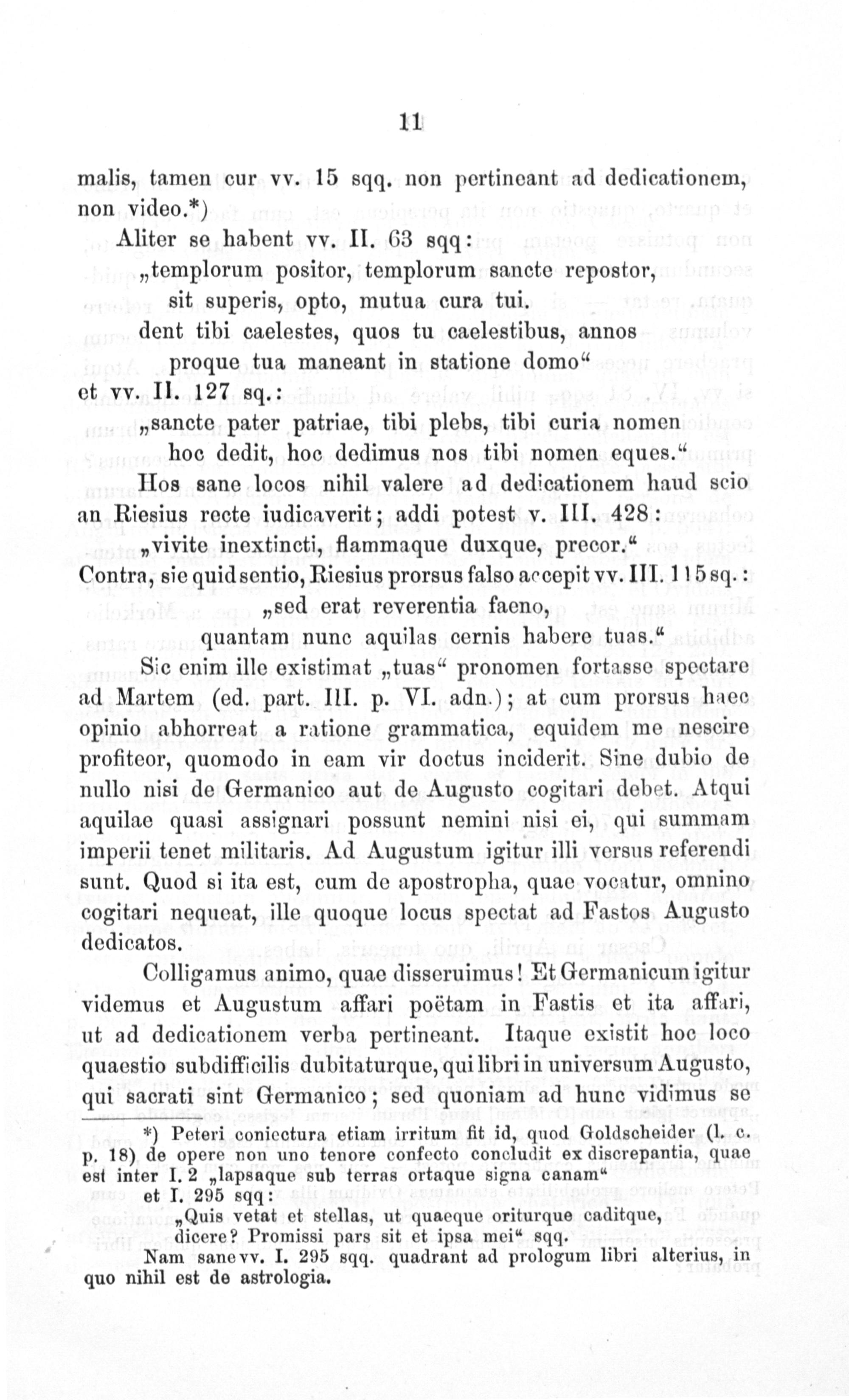 *) Peteri conicctura etiam irritum fit id, quod Goldscheider(I. c. p. 18) de opere non uno tenore confecto concludit ex discrepantia, quae est inter I. 2„lapsaque sub terras ortaque signa canam“ et I. 295 sqq: „Quis vetat et stellas, ut quaeque oriturque caditque, dicere? Promissi pars sit et ipsa mei“ sqq. Nam sanevv. I. 295 sqq. quadrant ad prologum libri alterius, in quo nihil est de astrologia.