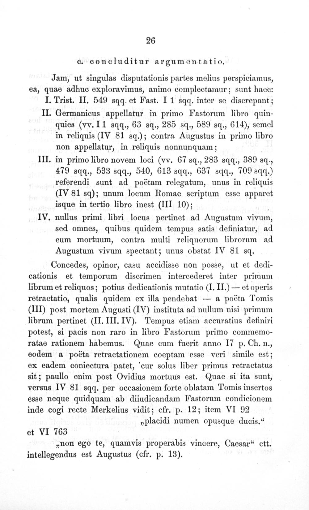 Concedes, opinor, casu accidisse non posse, ut et dedi- cationis et temporum discrimen intercederet inter primum librum et reliquos; potius dedicationis mutatio(I. II.)— et operis retractatio, qualis quidem ex illa pendebat— a poëta Tomis (III) post mortem Augusti(IV) instituta ad nullum nisi primum librum pertinet(II. III. IV). Tempus etiam accuratius definiri potest, si pacis non raro in libro Fastorum primo commemo- ratae rationem habemus.(Quae cum fuerit anno I7 p. Ch. n., eodem a poëta retractationem coeptam esse veri simile est; ex eadem coniectura patet, cur solus liber primus retractatus sit; paullo enim post Ovidius mortuus est. Quae si ita sunt, versus IV 81 sqq. per occasionem forte oblatam Tomis insertos esse neque quidquam ab diiudicandam Fastorum condicionem inde cogi recte Merkelius vidit; cfr. p. 12; item VI 92