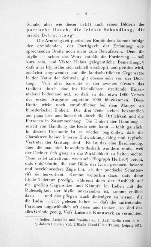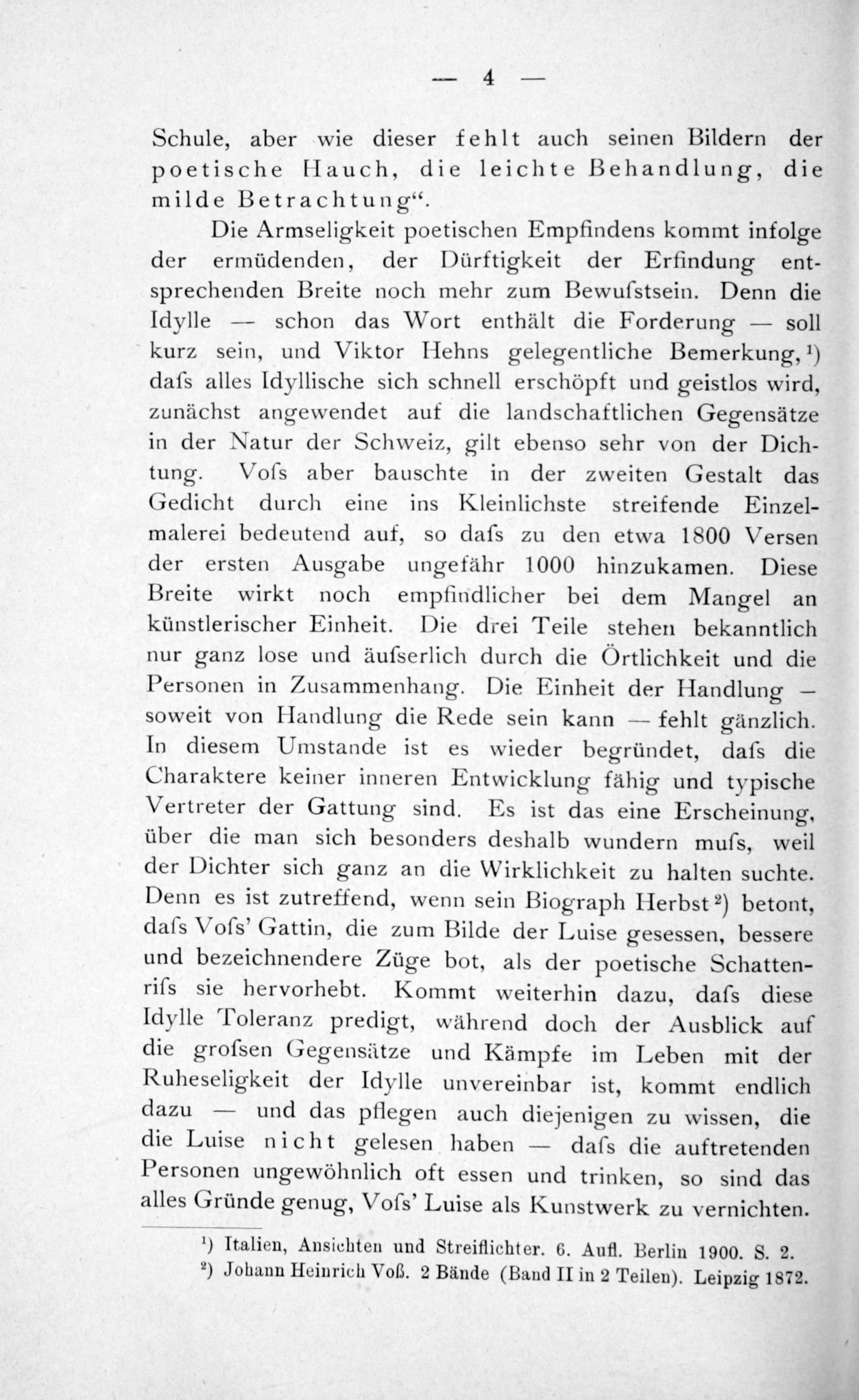 Die Armseligkeit poetischen Empfindens kommt infolge der ermüdenden, der Dürftigkeit der Erfindung ent- sprechenden Breite noch mehr zum Bewuſstsein. Denn die Idylle— schon das Wort enthält die Forderung— soll kurz sein, und Viktor Hehns gelegentliche Bemerkung, ¹) daſs alles Idyllische sich schnell erschöpft und geistlos wird, zunächst angewendet auf die landschaftlichen Gegensätze in der Natur der Schweiz, gilt ebenso sehr von der Dich- tung. Voſs aber bauschte in der zweiten Gestalt das Gedicht durch eine ins Kleinlichste streifende Einzel- malerei bedeutend auf, so daſs zu den etwa 1800 Versen der ersten Ausgabe ungefähr 1000 hinzukamen. Diese Breite wirkt noch empfindlicher bei dem Mangel an künstlerischer Einheit. Die drei Teile stehen bekanntlich nur ganz lose und äuſserlich durch die Ortlichkeit und die Personen in Zusammenhang. Die Einheit der Handlung— soweit von Handlung die Rede sein kann— fehlt gänzlich. In diesem Umstande ist es wieder begründet, daſs die Charaktere keiner inneren Entwicklung fâhig und typische Vertreter der Gattung sind. Es ist das eine Erscheinung. über die man sich besonders deshalb wundern muſs, weil der Dichter sich ganz an die Wirklichkeit zu halten suchte. Denn es ist zutreffend, wenn sein Biograph Herbst ²) betont, daſs Voſs' Gattin, die zum Bilde der Luise gesessen, bessere und bezeichnendere Züge bot, als der poetische Schatten- riſs sie hervorhebt. Kommt weiterhin dazu, daſs diese ldylle Toleranz predigt, während doch der Ausblick auf die groſsen Gegensätze und Kämpfe im Leben mit der Ruheseligkeit der Idylle unvereinbar ist, kommt endlich dazu— und das pflegen auch diejenigen zu wissen, die die Luise nicht gelesen haben— daſs die auftretenden Personen ungewöhnlich oft essen und trinken, so sind das alles Gründe genug, Voſs' Luise als Kunstwerk zu vernichten.