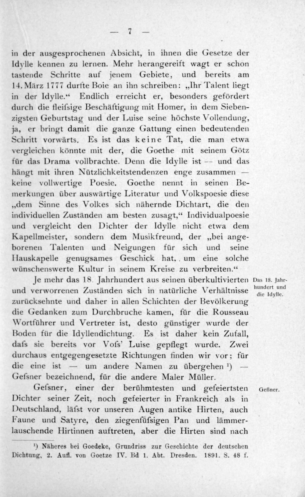 in der ausgesprochenen Absicht, in ihnen die Gesetze der Idylle kennen zu lernen. Mehr herangereift wagt er schon tastende Schritte auf jenem Gebiete, und bereits am 14. März 1777 durfte Boie an ihn schreiben:„Ihr Talent liegt in der Idylle.“ Endlich erreicht er, besonders gefördert durch die fleiſsige Beschäftigung mit Homer, in dem Sieben- zigsten Geburtstag und der Luise seine höchste Vollendung, ja, er bringt damit die ganze Gattung einen bedeutenden Schritt vorwärts. Es ist das keine Tat, die man etwa vergleichen könnte mit der, die Goethe mit seinem Gôtz für das Drama vollbrachte. Denn die Idylle ist— und das hängt mit ihren Nützlichkeitstendenzen enge zusammen— keine vollwertige Poesie. Goethe nennt in seinen Be- merkungen über auswärtige Literatur und Volkspoesie diese „dem Sinne des Volkes sich nähernde Dichtart, die den individuellen Zuständen am besten zusagt,“ Individualpoesie und vergleicht den Dichter der Idylle nicht etwa dem Kapellmeister, sondern dem Musikfreund, der„bei ange- borenen Talenten und Neigungen für sich und seine Ilauskapelle genugsames Geschick hat. um eine solche wünschenswerte Kultur in seinem Kreise zu verbreiten.“ Je mehr das 18. Jahrhundert aus seinen überkultivierten und verworrenen Zuständen sich in natürliche Verhältnisse zurücksehnte und daher in allen Schichten der Bevölkerung die Gedanken zum Durchbruche kamen, für die Rousseau Wortführer und Vertreter ist, desto günstiger wurde der Boden für die Idyllendichtung. Es ist daher kein Zutfall, daſs sie bereits vor Voſs' Luise gepflegt wurde. Zwei durchaus entgegengesetzte Richtungen finden wir vor; für die eine ist— um andere Namen zu übergehen¹)— Geſsner bezeichnend, für die andere Maler Müller. Geſsner, einer der berühmtesten und gefeiertsten Dichter seiner Zeit, noch gefeierter in Frankreich als in Deutschland, läſst vor unseren Augen antike Hirten, auch Faune und Satyre, den ziegenfüſsigen Pan und lämmer- lauschende Hirtinnen auftreten, aber die Hirten sind nach