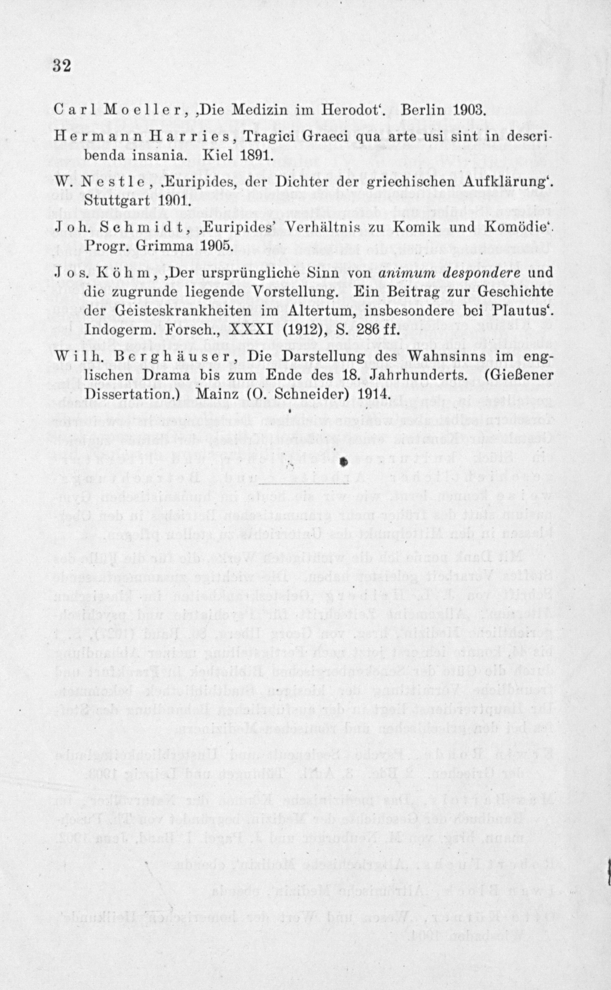 Jos. Köhm, ‚Der ursprüngliche Sinn von animum despondere und die zugrunde liegende Vorstellung. Ein Beitrag zur Geschichte der Geisteskrankheiten im Altertum, insbesondere bei Plautus'. Indogerm. Forsch., XXXI(1912), S. 286 ff.