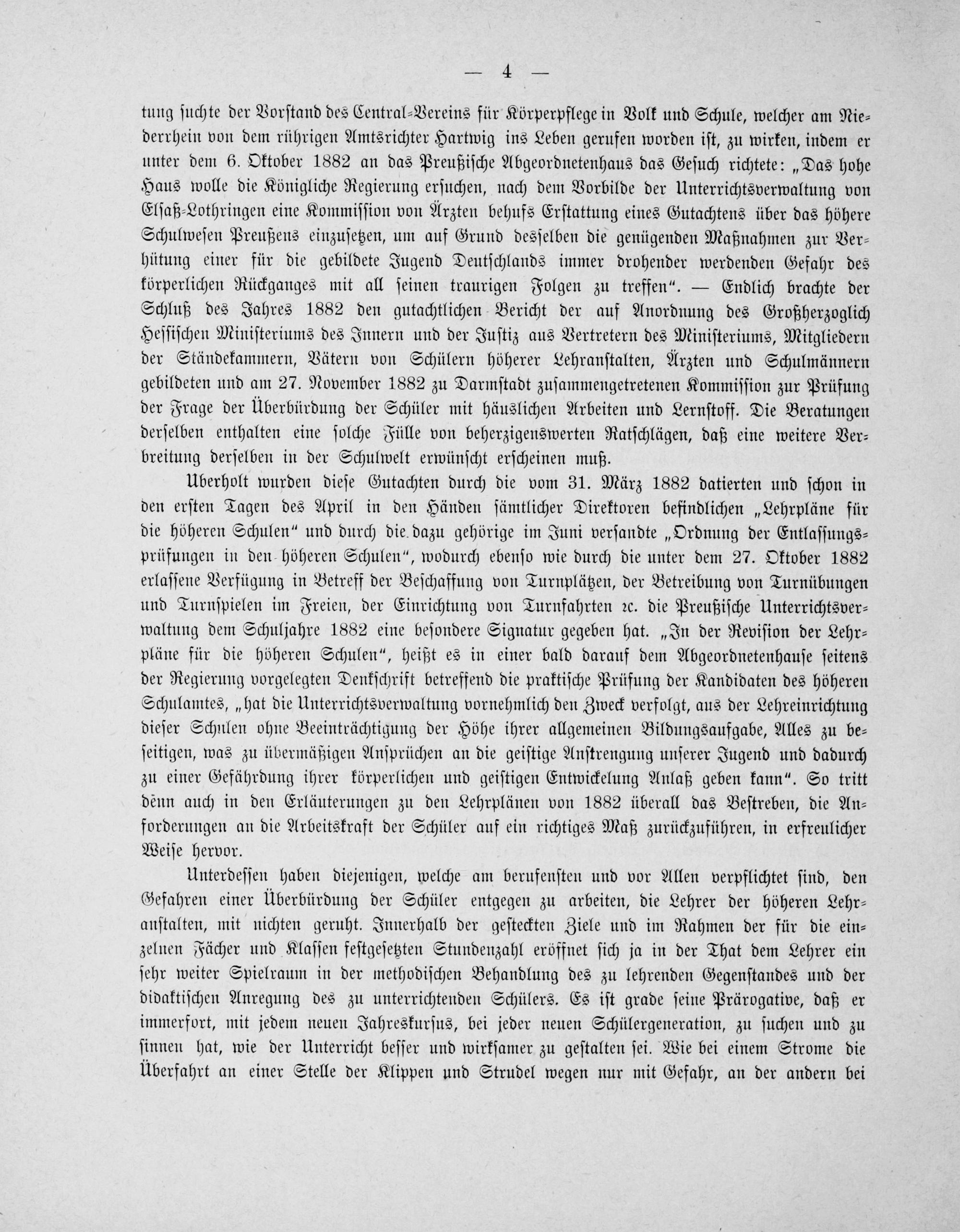 tung ſuchte der Vorſtand des Central⸗Vereins für Körperpflege in Volk und Schule, welcher am Nie⸗ derrhein von dem rührigen Amtsrichter Hartwig ins Leben gerufen worden iſt, zu wirken, indem er unter dem 6. Oktober 1882 an das Preußiſche Abgeordnetenhaus das Geſuch richtete:„Das hohe Haus wolle die Königliche Regierung erſuchen, nach dem Vorbilde der Unterrichtsverwaltung von Elſaß⸗Lothringen eine Kommiſſion von Ärzten behufs Erſtattung eines Gutachtens über das höhere Schulweſen Preußens einzuſetzen, um auf Grund desſelben die genügenden Maßnahmen zur Ver⸗ hütung einer für die gebildete Jugend Deutſchlands immer drohender werdenden Gefahr des körperlichen Rückganges mit all ſeinen traurigen Folgen zu treffen“.— Endlich brachte der Schluß des Jahres 1882 den gutachtlichen Bericht der auf Anordnung des Großherzoglich Heſſiſchen Miniſteriums des Innern und der Juſtiz aus Vertretern des Miniſteriums, Mitgliedern der Ständekammern, Vätern von Schülern höherer Lehranſtalten, Ärzten und Schulmännern gebildeten und am 27. November 1882 zu Darmſtadt zuſammengetretenen Kommiſſion zur Prüfung der Frage der Überbürdung der Schüler mit häuslichen Arbeiten und Lernſtoff. Die Beratungen derſelben enthalten eine ſolche Fülle von beherzigenswerten Ratſchlägen, daß eine weitere Ver⸗ breitung derſelben in der Schulwelt erwünſcht erſcheinen muß.