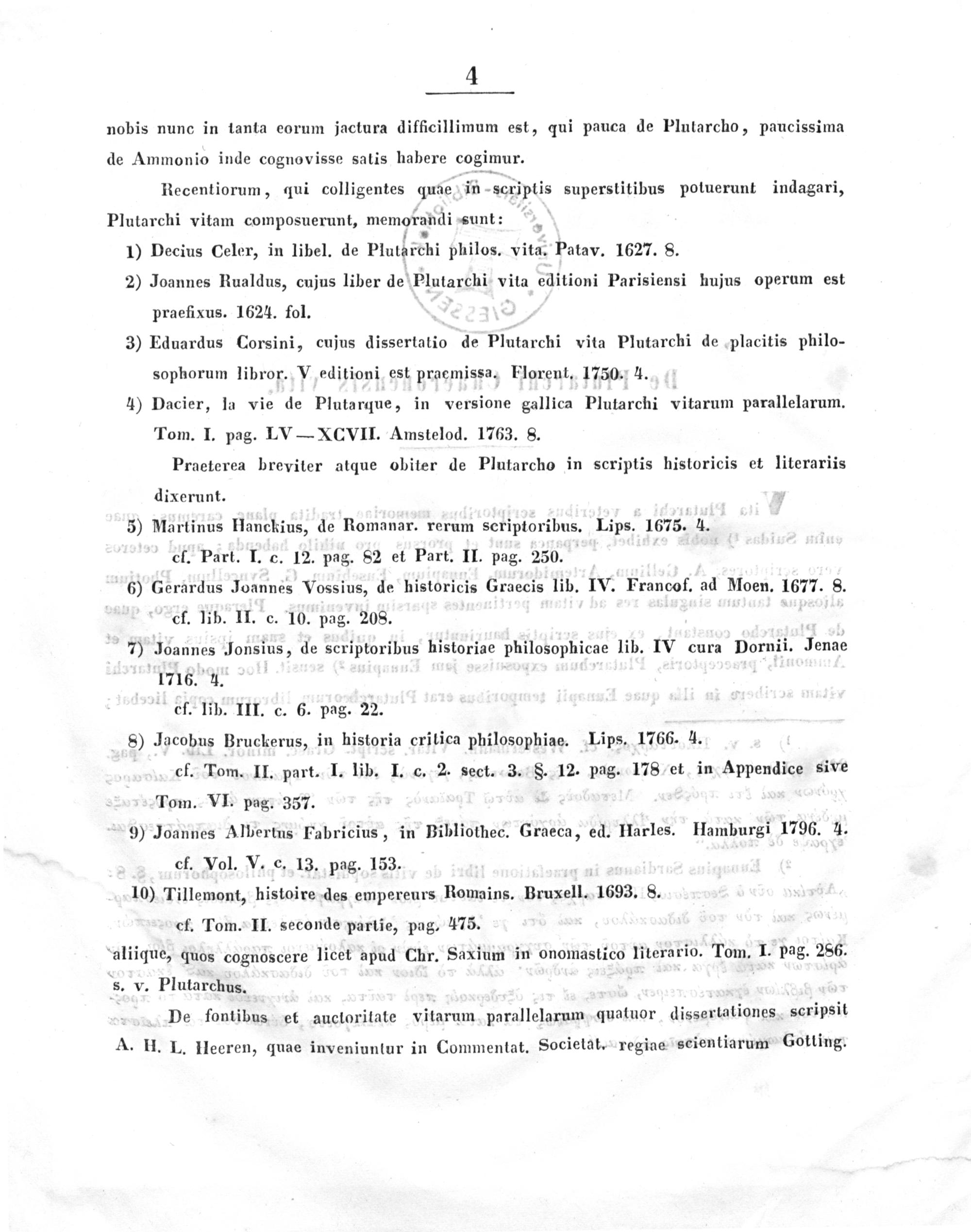 nobis nunc in tanta eorum jactura difficillimum est, qui pauca de Plutarcho, paucissima de Ammonio inde cognovisse satis habere cogimur. Recentiorum, qui colligentes quae mn„sorjptis superstitibus potuerunt indagari, Plutarchi vitam composuerunt, memorandi sunt: 1) Decius Celer, in libel. de plutärchi philos. vita. Patav. 1627. 8. 2) Joannes Rualdus, cujus liber de Plutarchi vita editioni Parisiensi hujus operum est praefixus. 1624. fol.— 3) Eduardus Corsini, cujus dissertatio de Plutarchi vita Plutarchi de placitis philo- sophorum libror. V editioni est praemissa. Florent. 1750. 4. 4) Dacier, la vie de Plutarque, in versione gallica Plutarchi vitarum parallelarum. Tom. I. pag. LV— XCVII. Amstelod. 1763. 8. Praeterea breviter atque obiter de Plutarcho in scriptis historicis et literariis dixerunt. 5) Martinus Hanckius, de Romanar. rerum scriptoribus. Lips. 1675. 4. cf. Part. I. c. 12. pag. 82 et Part. II. pag. 250. 6) Gerardus Joannes Vossius, de historicis Graecis lib. IV. Francof. ad Moen. 1677. 8. cf. lib. II. c. 10. pag. 208. 7) Joannes Jonsius, de scriptoribus historiae philosophicae lib. IV cura Dornii. Jenae 1716. 4. cf. lib. III. c. 6. pag. 22. 8) Jacobus Bruckerus, in historia critica philosophiae. Lips. 1766. 4. cf. Tom. II. part. I. lib. I. c. 2. sect. 3.§. 12. pag. 178 et in Appendice sive Tom. VI. pag. 357. 9) Joannes Albertus Fabricius, in Bibliothec. Graeca, ed. Harles. Hamburgi 1796. 4. cf. Vol. V. c. 13. pag. 153. 10) Tillemont, histoire des empereurs Romains. Bruxell. 1693. 8. cf. Tom. II. seconde partie, pag. 475. aliique, quos cognoscere licet apud Chr. Saxium in onomastico literario. Tom. I. pag. 286. s. v. Plutarchus. De fontibus et auctoritate vitarum parallelarum quatuor dissertationes scripsit
