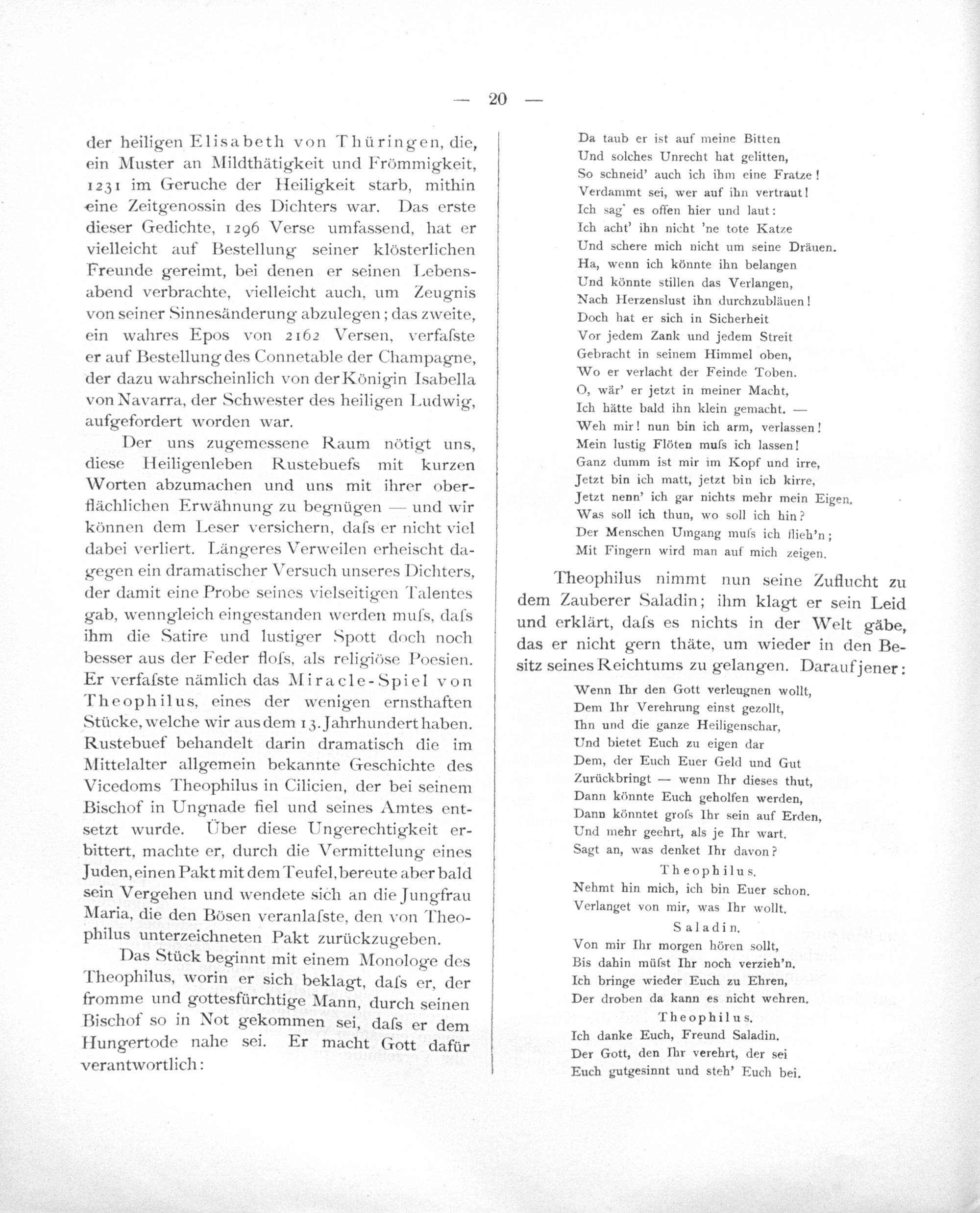 Der uns zugemessene Raum notigt uns, diese Heiligenleben Rustebuefs mit kurzen Worten abzumachen und uns mit ihrer ober- flächlichen Erwähnung zu begnügen— und wir können dem Leser versichern, dafs er nicht viel dabei verliert. Längeres Verweilen erheischt da- gegen ein dramatischer Versuch unseres Dichters, der damit eine Probe seines vielseitigen Talentes gab, wenngleich eingestanden werden muſs, daſs ihm die Satire und lustiger Spott doch noch besser aus der Feder floſs, als religiöse Poesien. Er verfaſste nämlich das Miracle-Spiel von Theophilus, eines der wenigen ernsthaften Stücke, welche wir aus dem 13. Jahrhundert haben. Rustebuef behandelt darin dramatisch die im Mittelalter allgemein bekannte Geschichte des Vicedoms Theophilus in Cilicien, der bei seinem Bischof in Ungnade fiel und seines Amtes ent- setzt wurde. Uber diese Ungerechtigkeit er- bittert, machte er, durch die Vermittelung eines Juden, einen Pakt mit dem Teufel, bereute aber bald sein Vergehen und wendete sich an die Jungfrau Maria, die den Bösen veranlaſste, den von Theo- philus unterzeichneten Pakt zurückzugeben.