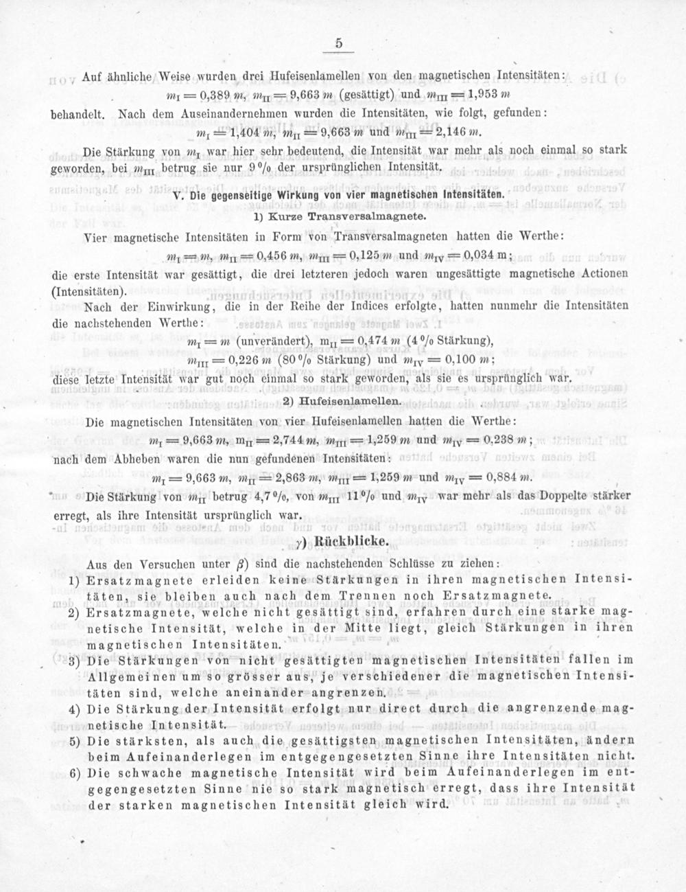 6) Die schwache magnetische Intensität wird beim Aufeinanderlegen im ent- gegengesetzten Sinne nie so stark magnetisch erregt, dass ihre Intensität der starken magnetischen Intensität gleich wird.