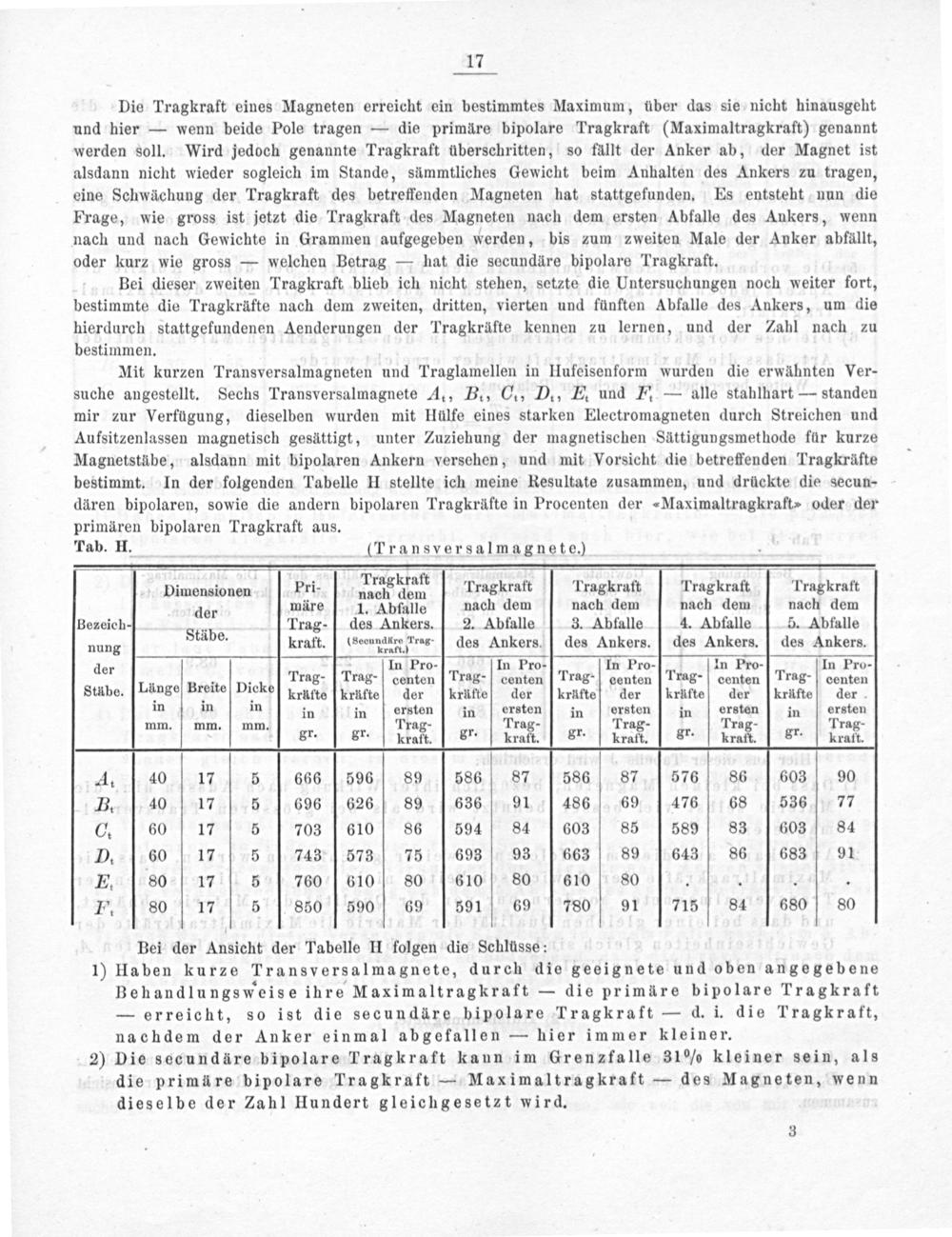 Mit kurzen Transversalmagneten und Traglamellen in Hufeisenform wurden die erwähnten Ver- suche angestellt. Sechs Transversalmagnete A., B., Ce, D., E. und E.— alle stahlhart— standen mir zur Verfügung, dieselben wurden mit Hülfe eines starken Electromagneten durch Streichen und Aufsitzenlassen magnetisch gesättigt, unter Zuziehung der magnetischen Sättigungsmethode für kurze Magnetstäbe, alsdann mit bipolaren Ankern versehen, und mit Vorsicht die betreffenden Tragkräfte bestimmt. In der folgenden Tabelle H stellte ich meine Resultate zusammen, und drückte die secun- dären bipolaren, sowie die andern bipolaren Tragkräfte in Procenten der ⸗Maximaltragkraft⸗ oder der primären bipolaren Tragkraft aus.