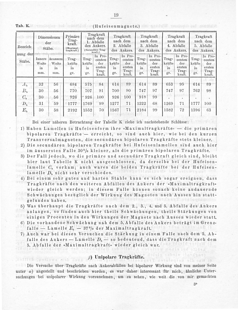 1) Haben Lamellen in Hufeisenform ihre Maximaltragkräfte⸗— die primären bipolaren Tragkräfte— erreicht, so sind auch hier, wie bei den kurzen Transversalmagneten, die secundären bipolaren Tragkräftestets kleiner.