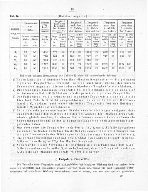 Tab. K.(Hufeisenmagnete.) Dimensionen Primäre Tragkraſt Tragkraft Tragkraft Tragkraft Tragkraft der Ura t. 1. Abfalle nach dem mnach dem nach dem nach dem Bezeich-„ des Ankers. 2. Abfalle 3. Abfalle 4. Abfalle 5. Abfalle 3 Stäbe.—(Secunauge Tras des Ankers.] des Ankers.] des Ankers.] des Ankers. nung der In Pro- In Pro- In Pro- In Pro- In Pro-