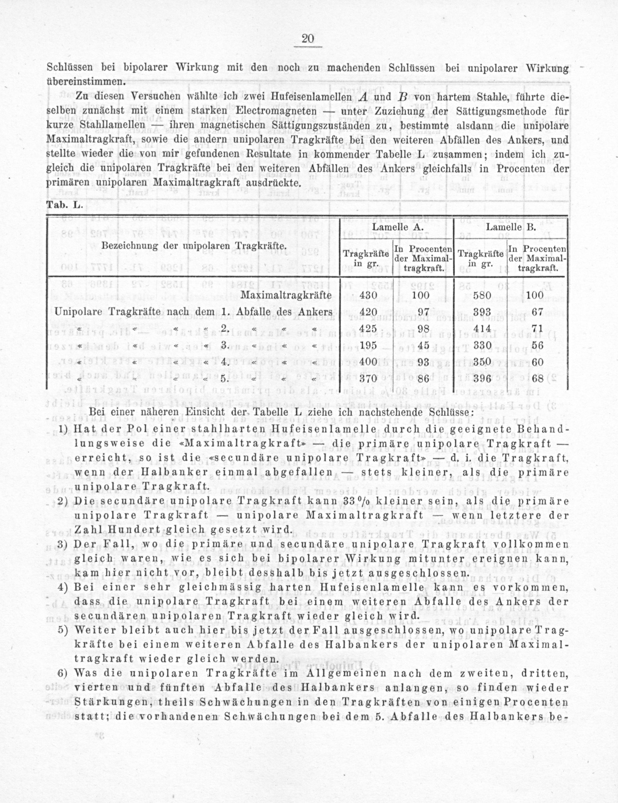 selben zunächst mit einem starken Electromagneten— unter Zuziehung der Sättigungsmethode für kurze Stahllamellen— ihren magnetischen Sättigungszuständen zu, bestimmte alsdann die unipolare Maximaltragkraft, sowie die andern unipolaren Tragkräfte bei den weiteren Abfällen des Ankers, und stellte wieder die von mir gefundenen Resultate in kommender Tabelle L zusammen; indem ich zu- gleich die unipolaren Tragkräfte bei den weiteren Abfällen des Ankers gleichfalls in Procenten der primären unipolaren Maximaltragkraft ausdrückte.
