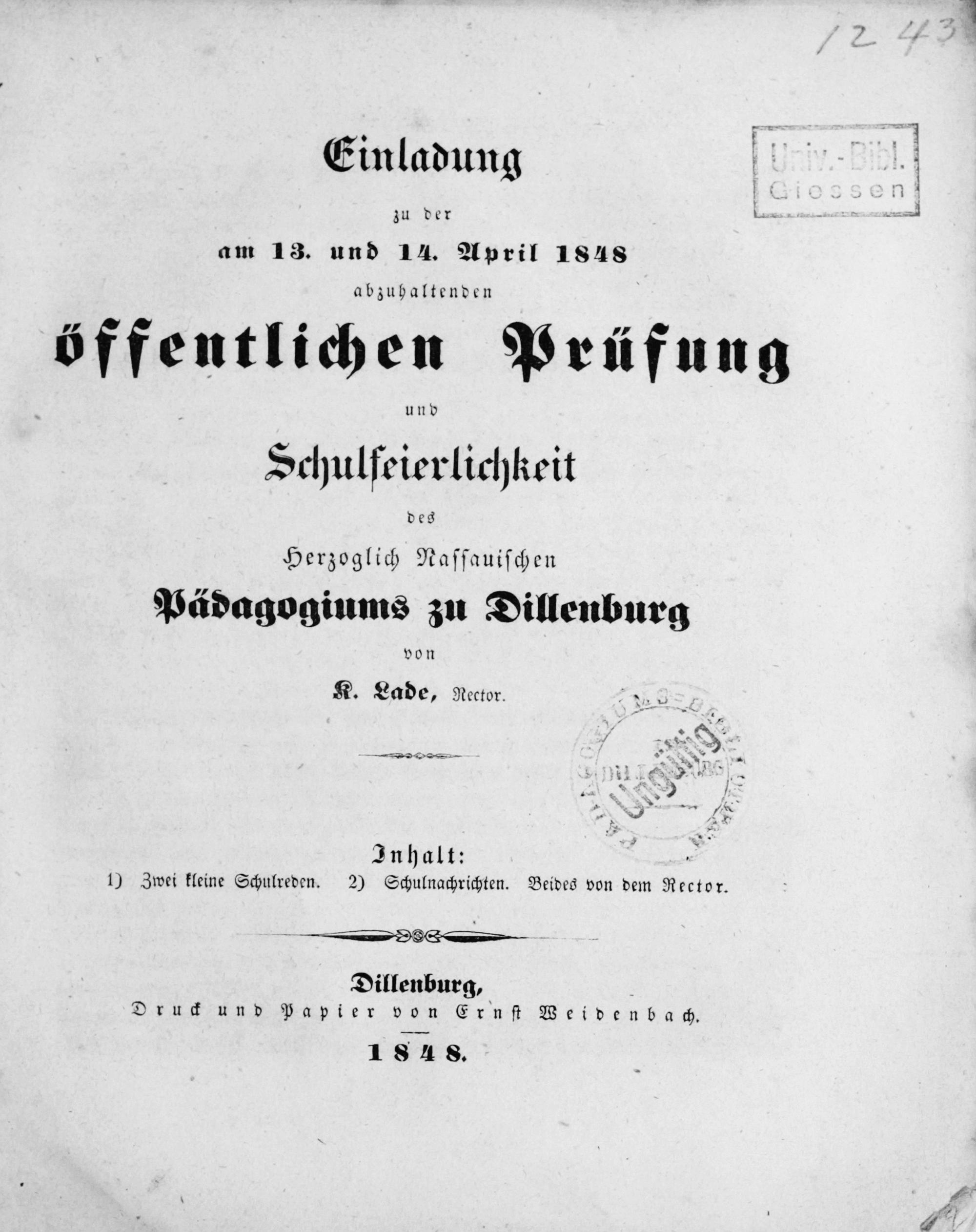 ——— 6 — 8 Inhalt: 1) Zwei kleine Schulreden. 2) Schulnachrichten. Beides von dem Rector. —— Dillenburg,