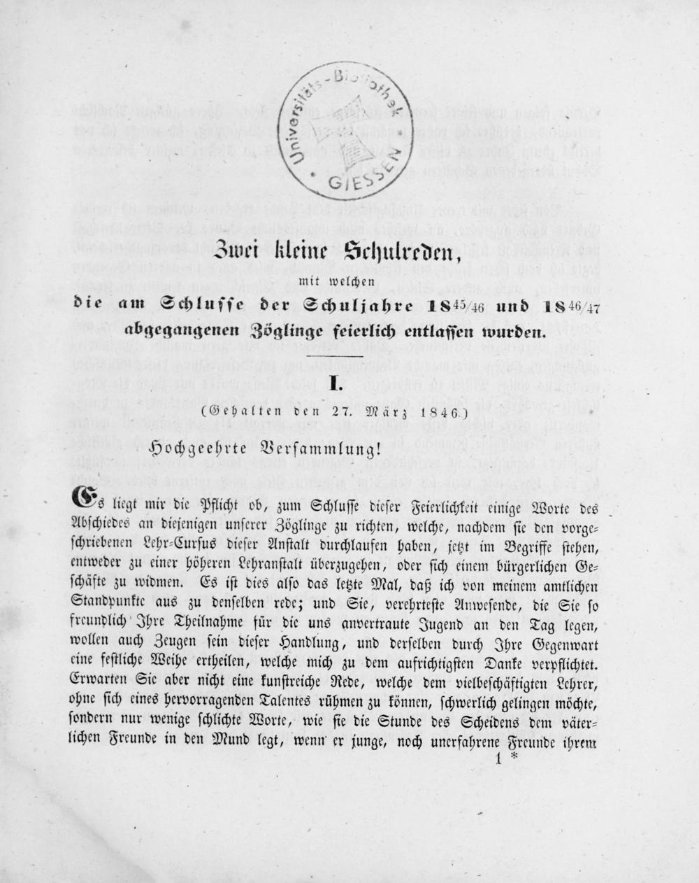 Zwei kleine Schulreden, mit welchen die am Schluſſe der Schuljahre 1845,46 und 1846,7 abgegangenen Zöglinge feierlich entlaſſen wurden.