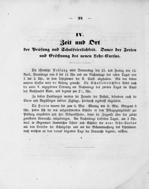 Die Ferien dauern bis zum 6. Mai. Montag den 8. Mai, Morgens 8 Uhr, haben ſich die neu aufzunehmenden Schüler in dem Pädagogialgebäude zur Prüfung einzufinden und ihre Geburtsſcheine, ſowie die Zeugniſſe über den zuletzt genoſſenen Unterricht, mitzubringen. Am Nachmittage desſelben Tages, um 2 Uhr, wird in Gegenwart ſämmtlicher Lehrer und Schüler der neue Lehr⸗Curſus mit dem Vorleſen der Schulgeſetze und mit der Bekanntmachung des Lehrplanes, nach welchem an dem darauf folgenden Tage der Unterricht beginnt, eröffnet.
