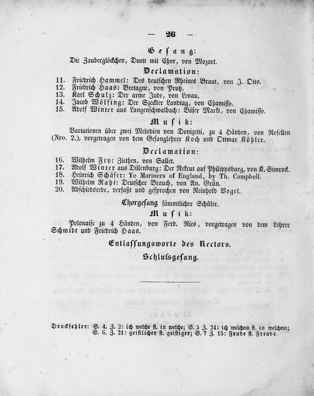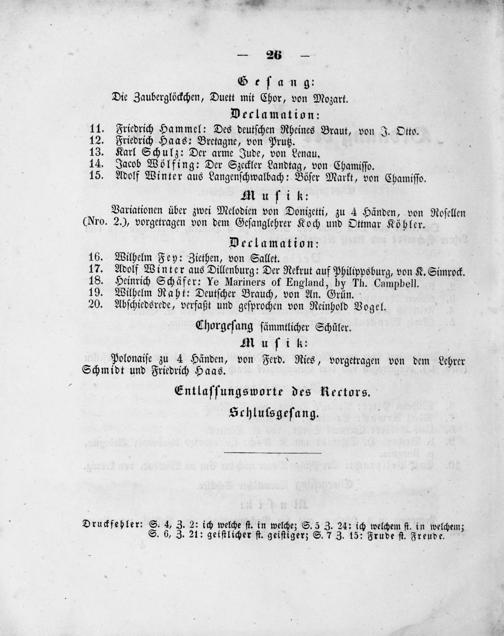 11. Friedrich Hammel: Des deutſchen Rheines Braut, von J. Otto. 12. Friedrich Haas: Bretagne, von Prutz. 13. Karl Schulz: Der arme Jude, von Lenau. 14. Jacob Wölfing: Der Szeckler Landtag, von Chamiſſo. 15. Adolf Winter aus Langenſchwalbach: Böſer Markt, von Chamiſſo. Muſik: Variationen über zwei Melodien von Donizetti, zu 4 Händen, von Roſellen (Nro. 2.), vorgetragen von dem Geſanglehrer Koch und Ottmar Köhler. Decrlamation: 16. Wilhelm Fey: Ziethen, von Sallet. 17. Adolf Winter aus Dillenburg: Der Rekrut auf Philippsburg, von K. Simrock. 18. Heinrich Schäfer: Ye Mariners of England, by Th. Campbell.