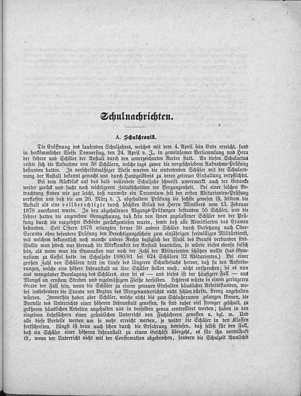 Bei dem Rückblick auf das bald vollendete Schuljahr ſchweift unvermerkt auch der Gedanke weiter zurück und ſucht nach wichtigeren Zeitabſchnitten der Vergangenheit. Bei einer ſolchen Be⸗ trachtung finden wir gar leicht, daß nunmehr ein Decennium ſeit der erſten Abiturienten⸗Prüfung verfloſſen und daß die am 20. März d. J. abgehaltene Prüfung die ſechſte geweſen iſt, ſeitdem die Anſtalt als eine vollberechtigte durch höchſten Erlaß des Herrn Miniſters vom 13. Februar 1878 anerkannt wurde. In den abgehaltenen Abgangs⸗Prüfungen beſtanden 55 Schüler, und die Lehrer hatten die angenehme Genugthuung, daß kein von ihnen zugelaſſener Schüler von der Prü⸗ fung durch die vorgeſetzte Behörde zurückgewieſen wurde, ſowie daß alle Admittierten das Examen beſtanden. Seit Oſtern 1878 erlangten ferner 30 andere Schüler durch Verſetzung nach Ober⸗ Secunda ohne beſondere Prüfung den Berechtigungsſchein zum einjährigen freiwilligen Militärdienſt, mit welchem bekanntlich noch manche andere Rechte bezüglich der Wahl des Berufs verbunden ſind. Wollte man jedoch nur hiernach die Wirkſamkeit der Anſtalt beurteilen, ſo würde dieſes ebenſo falſch ſein, als wenn man die Gymnaſien nur nach der Zahl der Abiturienten ſchätzen wollte(das Gym⸗ naſium zu Caſſel hatte im Schuljahr 1880/81 bei 624 Schülern 32 Abiturienten.) Bei einer großen Zahl von Schülern tritt im Laufe des längeren Schulbeſuchs hervor, daß ſie den Anforde⸗ rungen, welche eine höhere Lehranſtalt an ihre Schüler ſtellen muß, nicht entſprechen; ſei es nun aus mangelnder Beanlagung des Schülers, oder ſei es— und dieſes iſt der häufigere Fall— aus Mangel an ernſtem Streben und regelmäßigem Fleiße derſelben. Letzteres würde in einem geringeren Grade der Fall ſein, wenn die Schüler zu einem genauen Einhalten häuslicher Arbeitsſtunden, wo⸗ bei insbeſondere die Stunde vor Beginn des Morgenunterrichts nicht fehlen dürfte, ſtreng angehalten würden. Immerhin haben aber Schüler, welche nicht bis zum Schlußexamen gelangen können, die Vorteile des Unterrichts einer höheren Lehranſtalt genoſſen, ſie ſind daher viel ſtrenger geſchult, zu größeren häuslichen Arbeiten angehalten und in denſelben genau controlliert worden; haben in den einzelnen Lehrfächern einen gründlichen Unterricht von Fachlehrern genoſſen u. dgl. m. Und alle dieſe Vorteile werden um ſo mehr erreicht werden, je weiter die Schüler in den Klaſſen fortſchreiten. Längſt iſt denn auch ſchon durch die Erfahrung bewieſen, daß ſelbſt für den Fall, daß ein Schüler einer höheren Lehranſtalt zu einem Geſchäft übergeht, es für ihn vorteilhaft iſt, wenn der Unterricht nicht mit der Confirmation abgebrochen, ſondern die Schulzeit thunlichſt
