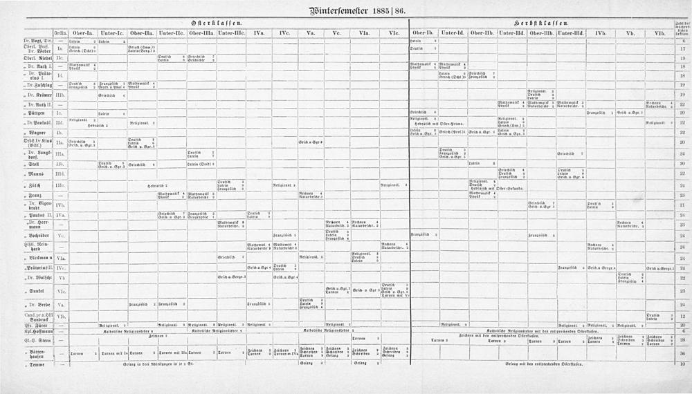 Oſterklaſſen. Herbſtlaſſen. 34u1e⸗ ———j—y————————= wochent⸗ Ordin. Ober-la. Unter-Ic. Ober-IIa. Unter-IIc. Ober-IIIa. Unter-IIIc.] IVa. IVc. Va. Ve. Vla. VIc. Ober-Ib. Unter-ld. Ober-Ib. Unter-IId.] Ober-llb. Unter.-Uld.] IVv. vv. VIN. ſlden Dr. Vogt, Dir.]— eatein 2 Latein 2 ſ jjutein 2 4— Oberl. Prof. Latein Griech(Hom.) s Dr. Weber 1. Griech.(Dht) 5 Latein(Verg.) 2 V Deutſch 3 17 i Deutſe 2 Griechiſch 7——— Oberl. Riedel IIe. Seuna 8 Geſchichte 2— 19 —— Mathematik 7 Mathematik 4 Mathematik 4 „ Dr. Auth I. hathem 1t 2 8 Phyſik 2 Phyſck 4 18 „ Dr. Präto⸗] Ia Latein 6(Griechiſch 7 rins I. Griech(Dcht)3 Franzoſiſch 2 18 — Deutſch 3 Franzöſiſch 2 Mathematik 4 3 „Dr. Zuſchlag Franzöſiſch 2 Nath u hſ. Phyſik 2— 19 Religionsl. 2 „ Dr. Krämer IIIb. Griechiſch 6 Deu ich 2 19 ——...... Latein 2——— .— Mathematik 4 Mathematik 3 Mathematik 3 9 „ Dr. Auth II. 2 Phyſik 2 Naturbeſchr. 2 Naturbeſchr. 2 Rechnenar. 4 22 „Püttgen Ic. Latein 6 Griechiſch 6 Franzöſiſch 5 Geſch u. Ggr. 3 20 Religionsl!. 2 Religionsl. 2 Relkgkonstte. „ Dr Paulusl. IId. debraiſa 1 Religionsl. 2 V SOe raiſch mit Oſter⸗Prima. darein(Ten.) 4 Religionsl. 38 22 4—— t.——— „ Wagner Ib.— Skein, ge, 3 Griech.(Proſ.)s Geſch.u. Ggr. 3 Latein, Ggr. 3— 2² OrdL. Dr.Kius, Ila. Oriechiſch 3 Seutſch 7 O.A en bene 4. Geſch. u. Ggr. 3 detein Ger.⸗— 4 03 5——ö ſ 20 Langs⸗ Deu tſch 2 Heni e——+ bre IIla. V Latein 7 Geian n Gr. 3 Griechiſch 7 24 „Stoll 11b. Heuſſch, d Grieciſch 1 Latein(Ovid) 2. 1 Latein 8 20 Griechiſch 4 Deutſe 2 „ Manns IIId. V Deutſch 2 Deetſch 2 22 3———— x Franzoſiſch 2— Geſch. u. Ggr. 3 65— Dcutſch 2 eligionsl. 2——————— ül IIIc. braiſch 2 Latein 9 Religionsl. 2 Religionsl. 3 Deutſch 2 2 „ Zülch V 1 gebeäiſ— Franzöſiſch 2— Hebraiſch mit Oſter⸗Sekundag..6— 24 . Mathematik 4 Mat tik 3 Rechnen 4 Mathematik 4—— „Frauz— Vhnſit 2 Wrnrorent. 3 ee Dpnſtt 4 23 Dr. Eigen⸗ IVp Griechiſch 7 Deutſch 2 ¹brodt lyb V Geſch⸗ u. Ggr 3 datein ⸗ 21 IV. 7 2 Deutſe 2“ 8 „ Paulus II.] IVa. eln e 4 en,d. den———— 2* Dr. Heer⸗ Mathematik 2 Rechnen 4 Rechnen 4———— De Naturbeſchr. 2 Naturbeſch. 2(Naturbeſchr. 2 Achnen hr. 4 23 Bochröder V—— F öſiſch 5— 3 Franzöſiſch 2 5.— . 3 atein oſt 2 „ Ve. ranzöſi Srandſin 4 Franzöſiſch 2 24 Hlſsl. Rein⸗ Mathemat. 4 Mathemat. 4 Rechnen 4———— hard— Manebeſchr? Naturbeſchr 2 Naturbeſchr. 2— 1 24 — Religionsſ. 3——— „ Bleckmann VIa. Griechiſch 7 Religionsl. 2 Deutſch 3 24 — Latein 9 2.— ¹ 2———— „Prätorius II.] IVc. Geſchu. Gar 4 Beutrch 2.—- 1 Franzöſiſch 2 Geſch. u Geogr. 4 Geſch u. Geogr. 3%)24 „Dr. Wolſcht Vb Geſch. u. Geogr. 3 Geſch. u. Ggr 4 Deutch 22 — Franzöſiſch 4 Ss . 3 eſch u. Ggr. „Sunkel VIc. Lurnen.gr.“ Geſch. u Gar ² Geſch u. Ggr. 3 23 — Turnen mit Vo— 7 Sen— 7. 5 2 2 5 5 „Dr. Brede Va. Franzöſiſch 20 Franzöſiſch Aranisich s Franbſiſch 4 1 24 Cand. pr. u. Hlfl 7 Deutſch 3 Sandrock Yb.—— Latein 9 12 Pfr. Fürer— Religionsl. 2 Religionsl. 2 Religionst. 2 Neligionsl. 2 Religionsl! 2 Religionsl. 2 2 Religionsl. 2 Religionsl. 2 Religionsl. 2 Religionst. 2 20 Kpl. Hoffmann— Katholiſche Religionslehre 2 Katholiſche Religionslehre 2 V Katholiſche Religionsleyre 2 Katholiſche Religionslehre mit den entſprechenden Oſterklaſſen. 6 Zeſchnen 2 Zeichnen mit den entſprechenden Oſterklaſſen. Zei Zeichnen 2 Zeichnen 2 El.⸗L. Stern— Turnen 2 Turnen 2 Zeichnen 2 Schreiben 2 Schreib — Turnen 2 Turnen 2 Turnen 2 Turnen 2 Seunem 2 Scheeit en 2 ätten-. 3 eichnen 2 Zeichnen 2 Zeichnen en 2 Zeichnen 2 Zeichnen 2 „ Bälien— ſurnen 2 Turnen mit la Turnen 2 Turnen mit IIaſTurnen 2 Turnen 2 Leichan 2 Turnen m.IVa Sareiben 2 Sehanpen 2 Schreiben 2 Shelden 2 „Temme— Geſang in drei Abteilungen in je 2 St. Geſana 2³ Geſang 2 Geſang mit den entſprechenden Oſterklaſſen. 10