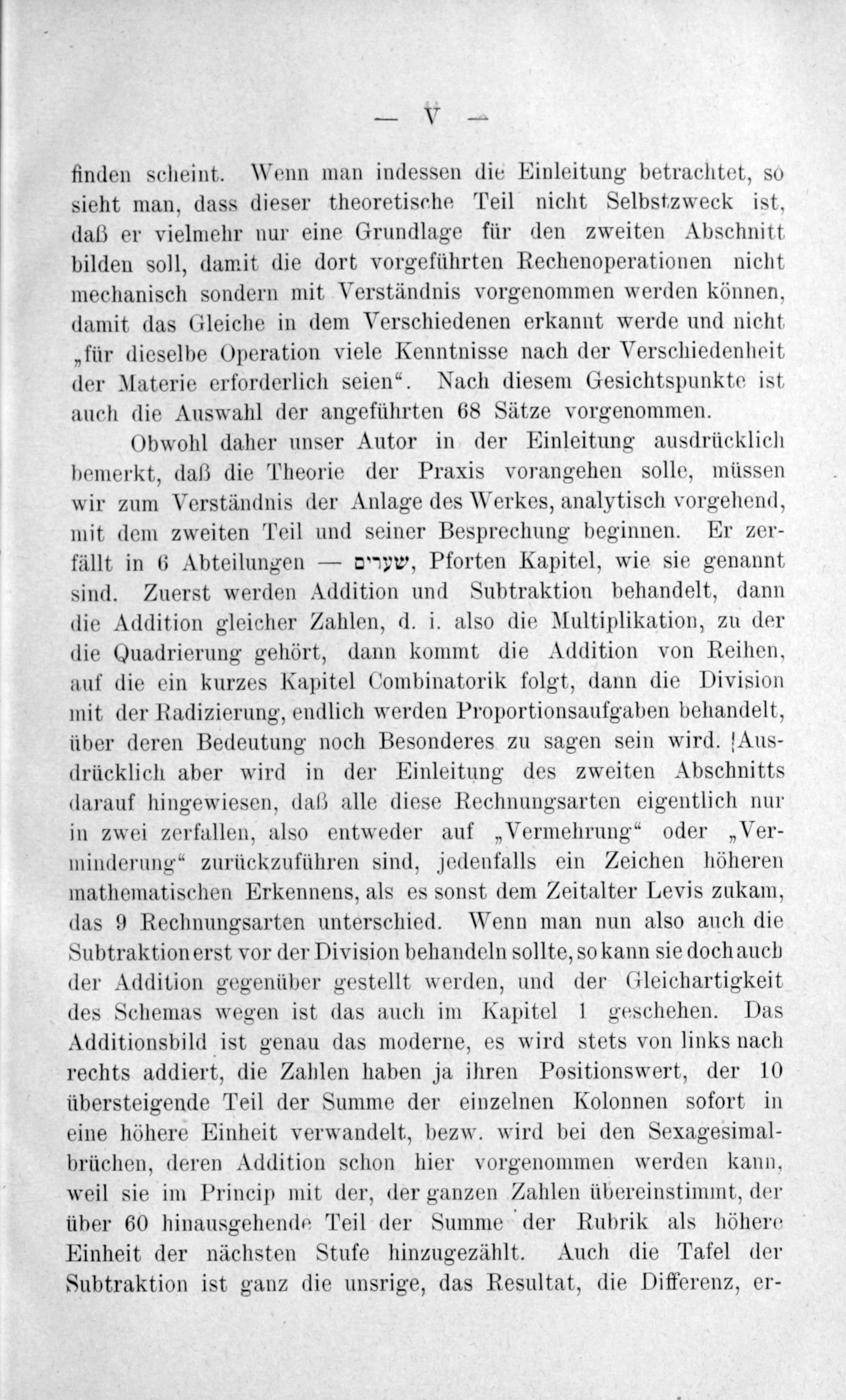 finden scheint. Wenn man indessen die Einleitung betrachtet, so sieht man, dass dieser theoretische Teil nicht Selbstzweck ist, daß er vielmehr nur eine Grundlage für den zweiten Abschnitt bilden soll, damit die dort vorgeführten Rechenoperationen nicht mechanisch sondern mit Verständnis vorgenommen werden können, damit das Gleiche in dem Verschiedenen erkannt werde und nicht „für dieselbe Operation viele Kenntnisse nach der Verschiedenheit der Materie erforderlich seien“. Nach diesem Gesichtspunkte ist- auch die Auswahl der angeführten 68 Sätze vorgenommen. Obwohl daher unser Autor in der Einleitung ausdrücklich bemerkt, daß die Theorie der Praxis vorangehen solle, müssen wir zum Verständnis der Anlage des Werkes, analytisch vorgehend, mit dem zweiten Teil und seiner Besprechung beginnen. Er zer- fällt in 6 Abteilungen— anyr', Pforten Kapitel, wie sie genannt sind. Zuerst werden Addition und Subtraktion behandelt, dann die Addition gleicher Zahlen, d. i. also die Multiplikation, zu der die Quadrierung gehört, dann kommt die Addition von Reihen, auf die ein kurzes Kapitel Combinatorik folgt, dann die Division mit der Radizierung, endlich werden Proportionsaufgaben behandelt, über deren Bedeutung noch Besonderes zu sagen sein wird. Aus- drücklich aber wird in der Einleitung des zweiten Abschnitts darauf hingewiesen, daß alle diese Rechnungsarten eigentlich nur in zwei zerfallen, also entweder auf„Vermehrung“ oder„Ver- minderung“ zurückzuführen sind, jedenfalls ein Zeichen höheren mathematischen Erkennens, als es sonst dem Zeitalter Levis zukam, das 9 Rechnungsarten unterschied. Wenn man nun also auch die Subtraktionerst vor der Division behandeln sollte, sokann sie doch auch der Addition gegenüber gestellt werden, und der Gleichartigkeit des Schemas wegen ist das auch im Kapitel 1 geschehen. Das Additionsbild ist genau das moderne, es wird stets von links nach rechts addiert, die Zahlen haben ja ihren Positionswert, der 10 übersteigende Teil der Summe der einzelnen Kolonnen sofort in eine höhere Einheit verwandelt, bezw. wird bei den Sexagesimal- brüchen, deren Addition schon hier vorgenommen werden kann, weil sie im Princip mit der, der ganzen Zahlen übereinstimmt, der über 60 hinausgehende Teil der Summe der Rubrik als höhere Einheit der nächsten Stufe hinzugezählt. Auch die Tafel der Subtraktion ist ganz die unsrige, das Resultat, die Differenz, er-