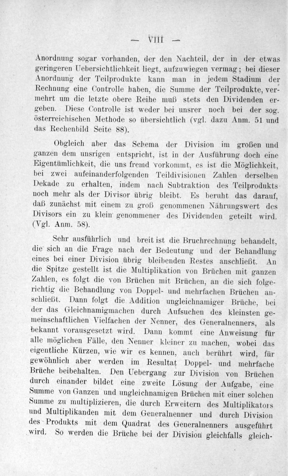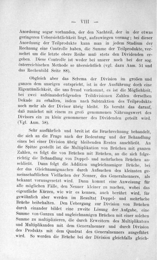 Anordnung sogar vorhanden, der den Nachteil, der in der etwas geringeren Uebersichtlichkeit liegt, aufzuwiegen vermag; bei dieser Anordnung der Teilprodukte kann man in jedem Stadium der Rechnung eine Controlle haben, die Summe der Teilprodukte, ver- mehrt um die letzte obere Reihe muß stets den Dividenden er- geben. Diese Controlle ist weder bei unsrer noch bei der sog. österreichischen Methode so übersichtlich(vgl. dazu Anm. 51 und das Rechenbild Seite 88).