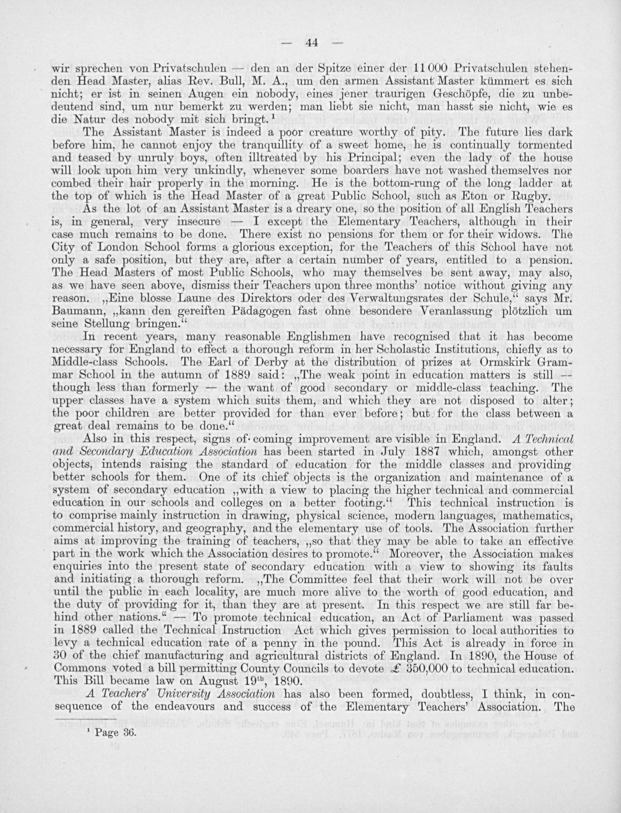 In recent years, many reasonable Englishmen have recognised that it has become necessary for England to effect a thorough reform in her Scholastic Institutions, chiefly as to Middle-class Schools. The Earl of Derby at the distribution of prizes at Ormskirk Gram- mar School in the autumn of 1889 said:„The weak point in education matters is still— though less than formerly— the want of good secondary or middle-class teaching. The upper classes have a system which suits them, and which they are not disposed to alter; the poor children are better provided for than ever before; but for the class between a great deal remains to be done.“