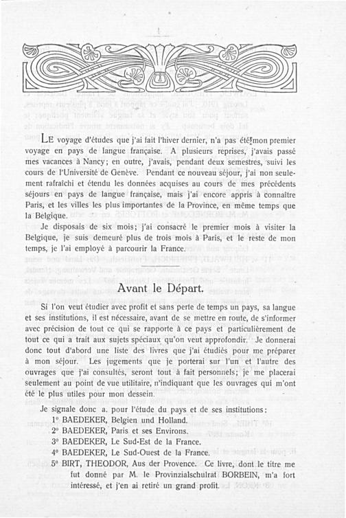 LE voyage d'études que j'ai fait l'hiver dernier, n'a pas étérmon premier voyage en pays de langue française. A plusieurs reprises, j'avais passé mes vacances à Nancy; en outre, j'avais, pendant deux semestres, Suivi les cours de l'Université de Genève. Pendant ce nouveau séjour, j'ai non seule- ment rafraichi et étendu les données acquises au cours de mes précédents séjours en pays de langue française, mais j'ai encore appris à connattre Paris, et les villes les plus importantes de la Province, en méème temps que la Belgique.