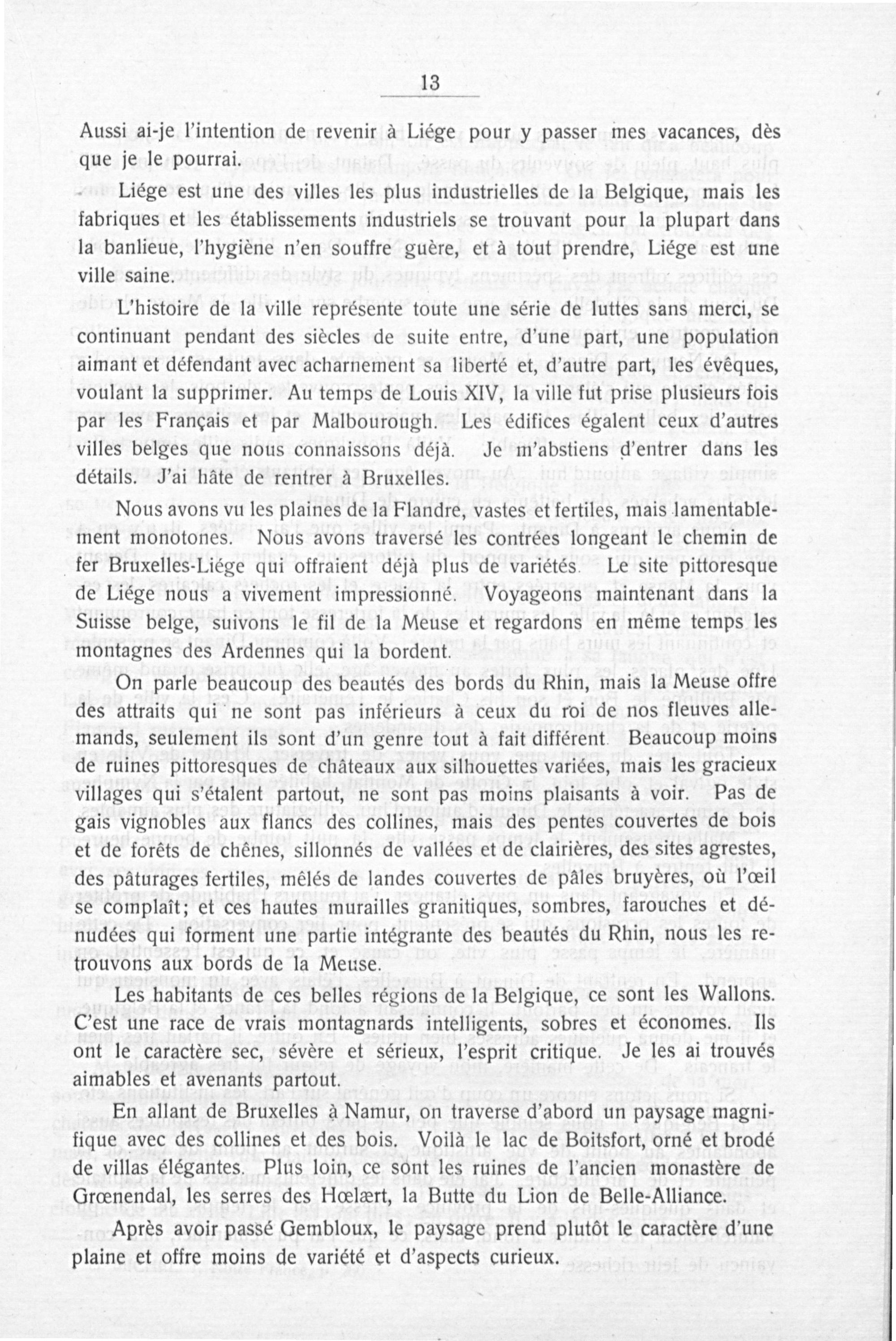 Les habitants de ces belles régions de la Belgique, ce sont les Wallons. C'est une race de vrais montagnards intelligents, sobres et économes. IIs ont le caractère sec, sévère et sérieux, l'esprit critique. Je les ai trouvés aimables et avenants partout.