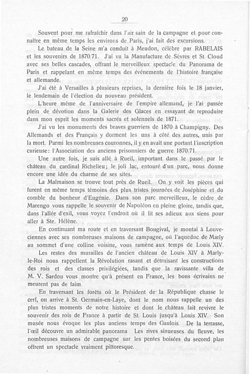 En traversant les foréts où le Président de la République chasse le cerf, on arrive à St. Germain-en-Laye, dont le nom nous rappelle un des. plus tristes moments de notre histoire et dont le chäteau fait revivre le souvenir des rois de France à partir de St. Louis jusqu'à Louis XIV. Son musée nous évoque les plus anciens temps des Gaulois. De la terrasse, l'œil découvre un admirable panorama Les rives sinueuses du fleuve, les nombreuses maisons de campagne sur les pentes boisées du second plan offrent un spectacle vraiment pittoresque.