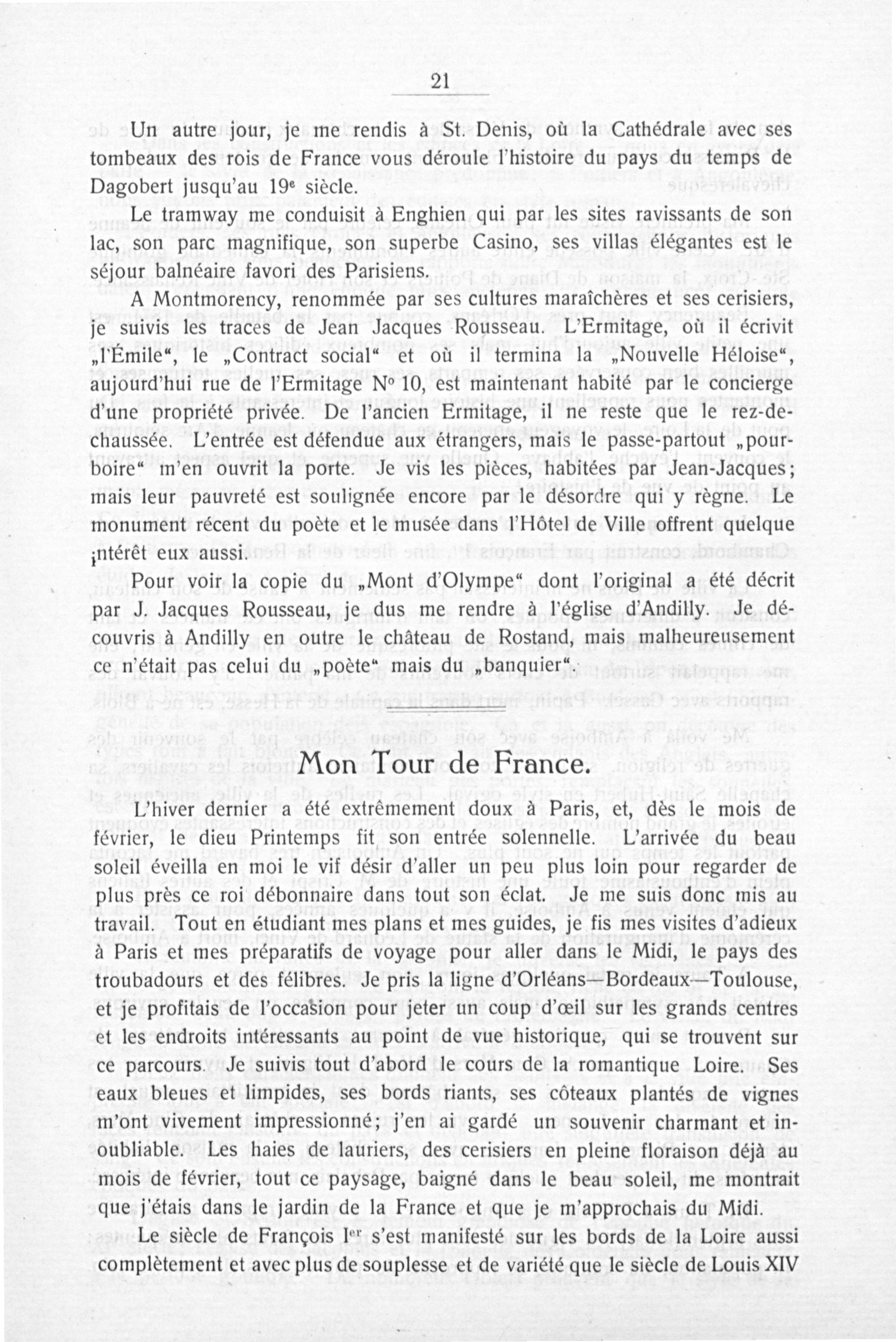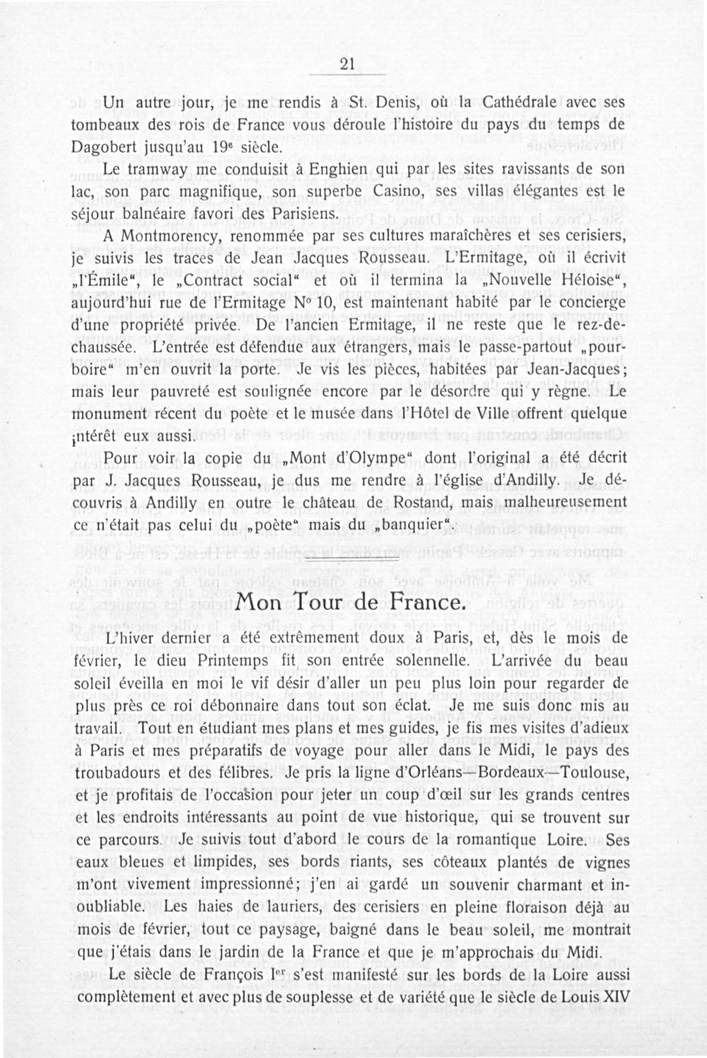 A Montmorency, renommée par ses cultures maraichères et ses cerisiers, je suivis les traces de Jean Jacques Rousseau. L'Ermitage, où il écrivit „l'Emile“, le„Contract social“ et où il termina la„Nouvelle Héloise“, aujourd'hui rue de l'Ermitage No 10, est maintenant habité par le concierge d'une propriété privée. De l'ancien Ermitage, il ne reste que le rez-de- chaussée. L'entrée est défendue aux étrangers, mais le passe-partout„pour- boire“ m'en ouyvrit la porte. Je vis les pièces, habitées par Jean-Jacques; mais leur pauvreté est soulignée encore par le désordre qui y règne. Le monument récent du poète et le musée dans''Hôtel de Ville offrent quelque intérét eux aussi.