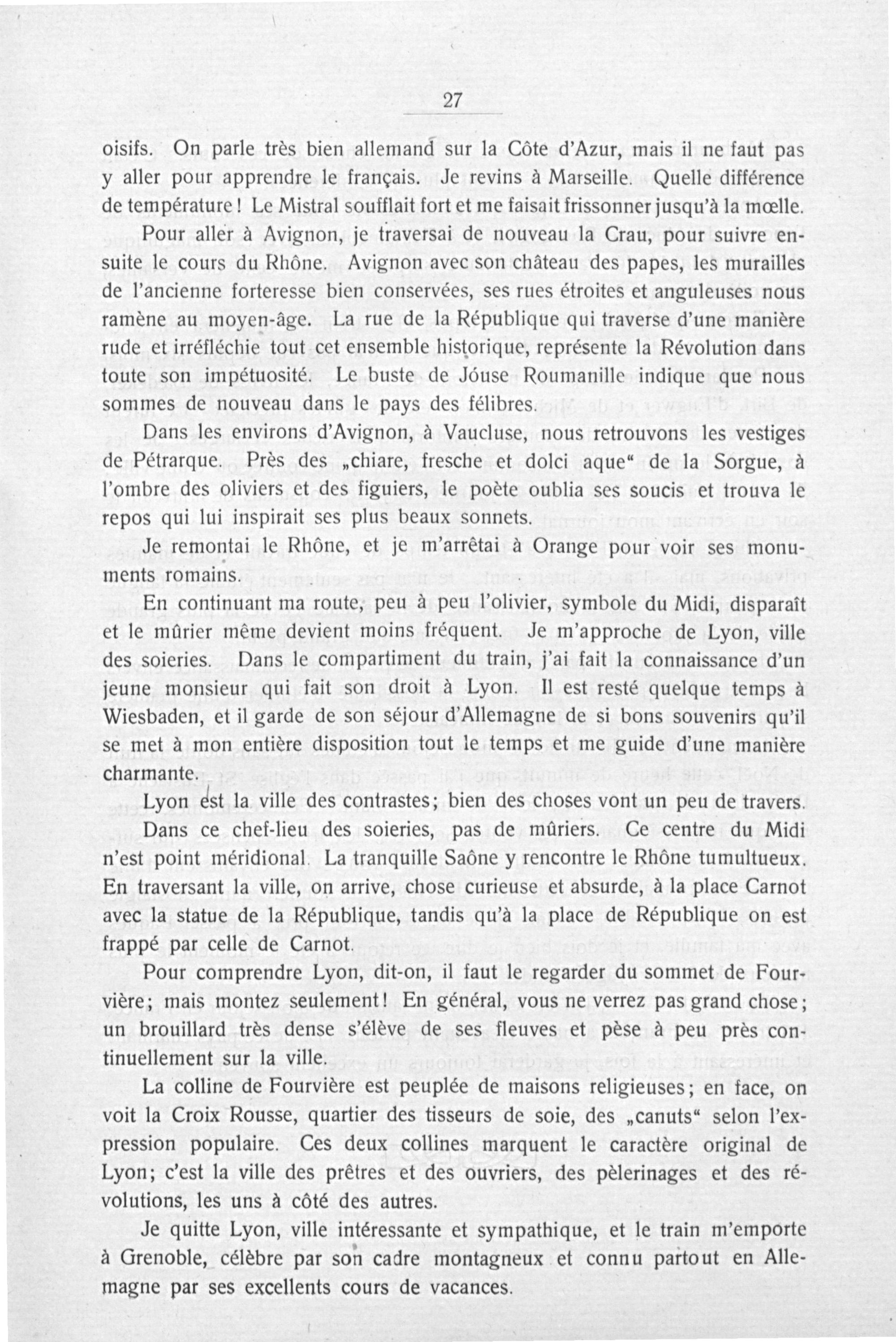 En continuant ma route, peu à peu l'olivier, symbole du Midi, disparait et le múͤrier même devient moins fréquent. Je m'approche de Lyon, ville des soieries. Dans le compartiment du train, j'ai fait la connaissance d'un jeune monsieur qui fait son droit à Lyon. II est resté quelque temps à Wiesbaden, et il garde de son séjour d'Allemagne de si bons souvenirs qu'il se met à mon entière disposition tout le temps et me guide d'une manière charmante.
