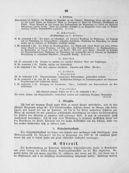 Ich darf mit warmem Danke gegen Gott zu meiner Freude wiederholen, was im vor⸗ jährigen Programm geſagt iſt: Die disciplinariſchen Zuſtände waren im Ganzen recht befrie⸗ digend, was ſowohl von den im Internat, als den in der Stadt wohnenden Schülern gilt. Wenn ich einerſeits die mir gewordene gewiſſenhafte Unterſtützung der Lehrer bei Ueberwachung der Schüler hier öffentlich zu erwähnen mich gedrungen fühle, ſo muß ich andererſeits gleich anerkennend hervorheben, daß ich auch einer Mitwirkung in wahrhaft chriſtlichem Sinne von den Bewohnern der Stadt, beſonders von der hochw. Geiſtlichkeit und den Lehrern, ſowie von den meiſten Koſtwirthen mich zu erfreuen hatte.
