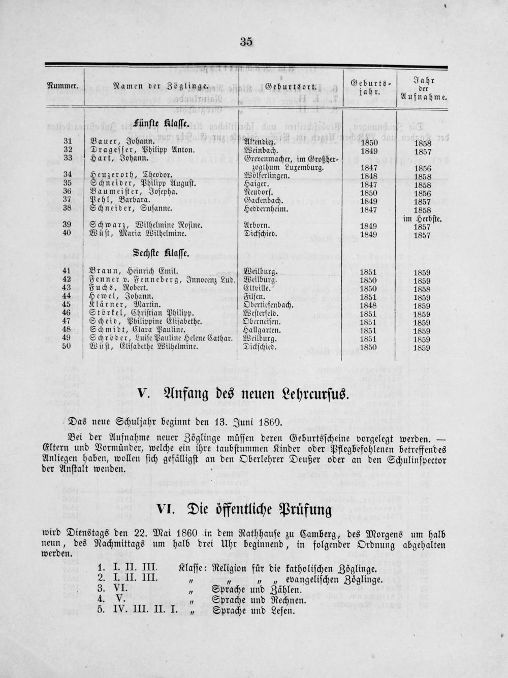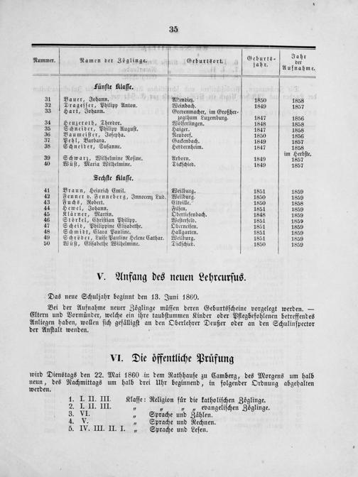 Jahr Nummer. Namen der Zöglinge. Geburtsort. Gfänres⸗ 94 1. Aufnahme. 2 Fünfte Klaſſe.