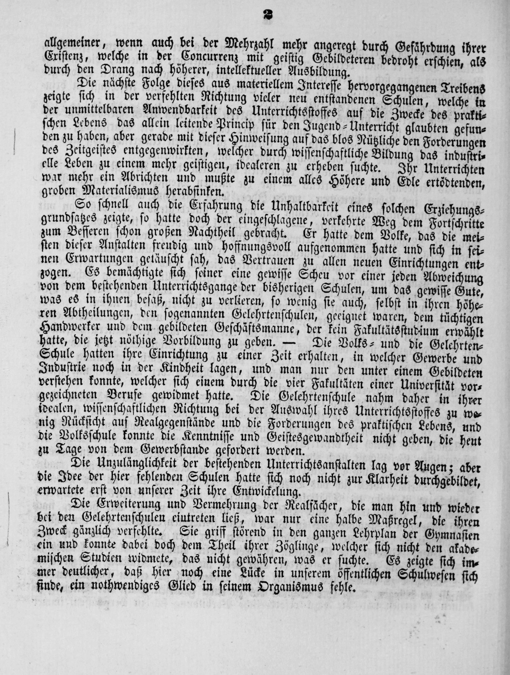 Die Erweiterung und Vermehrung der Realfächer, die man hin und wieder bei den Gelehrtenſchulen eiutreten ließ, war nur eine halbe Maßregel, die ihren Zweck gänzlich verfehlte. Sie griff ſtörend in den ganzen Lehrplan der Gymnaſien ein und konnte dabei doch dem Theil ihrer Zöglinge, welcher ſich nicht den akade⸗ miſchen Studien widmete, das nicht gewähren, was er ſuchte. Es zeigte ſich im⸗ mer deutlicher, daß hier noch eine Lücke in unſerem öffentlichen Schulweſen ſich finde, ein nothwendiges Glied in ſeinem Organismus fehle.