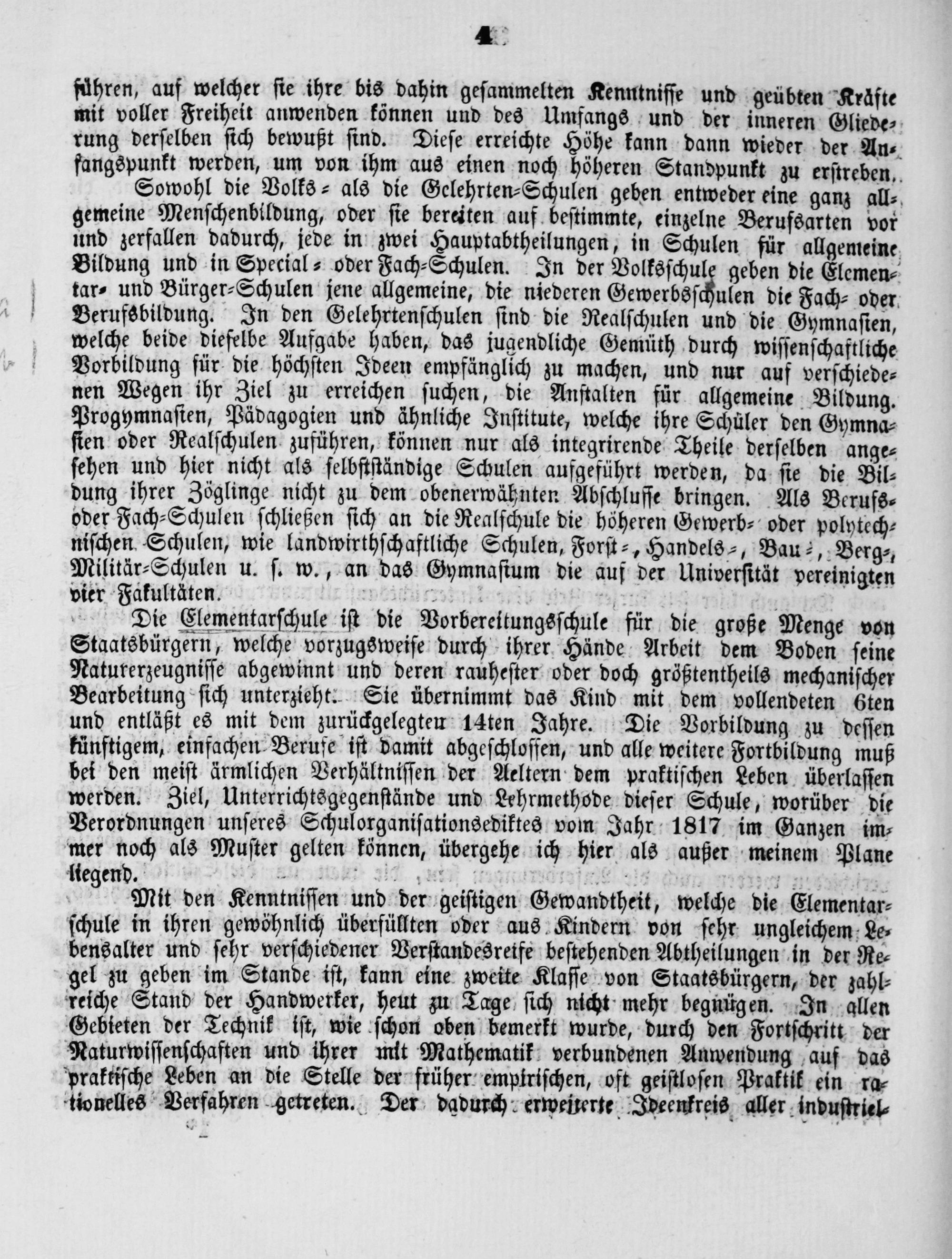 Die Clementarſchule iſt die Vorbereitungsſchule für die große Menge von Staatsbürgern, welche vorzugsweiſe durch ihrer Hände Arbeit dem Boden ſeine Natuterzeugniſſe abgewinnt und deren rauheſter oder doch größtentheils mechaniſcher Bearbeitung ſich unterzieht. Sie übernimmt das Kind mit dem vollendeten 6ten und entläßt es mit dem zurückgelegten 14ten Jahre. Die Vorbildung zu deſſen künftigem, einfachen Berufe iſt damit abgeſchloffen, und alle weitere Fortbildung muß bei den meiſt ärmlichen Verhältniſſen der Aeltern dem praktiſchen Leben überlaſſen werden. Ziel, Unterrichtsgegenſtände und Lehrmethode dieſer Schule, worüber die Verordnungen unſeres Schulorganiſationsediktes vom Jahr 1817 im Ganzen im⸗ mer noch als Muſter gelten können, übergehe ich hier als außer meinem Plane liegend. 2 2 2 211 1u3.. 7 4 Mit den Kenntniſſen und der geiſtigen Gewandtheit, welche die Elementar⸗ ſchule in ihren gewöhnlich überfüllten oder aus Kindern von ſehr ungleichem Le⸗ bensalter und ſehr verſchiedener Verſtandesreife beſtehenden Abtheilungen in der Re⸗ gel zu geben im Stande iſt, kann eine zweite Klaſſe von Staatsbürgern, der zahl⸗ reiche Stand der Handwerker, heut zu Tage ſich nicht mehr begnügen. In allen Gebieten der Technik iſt, wie ſchon oben bemerkt wurde, durch den Fortſchritt der Naturwiſſenſchaften und ihrer mit Mathematik verbundenen Anwendung auf das praktiſche Leben an die Stelle der früher empiriſchen, oft geiſtloſen Praktik ein ra⸗ tionelles Verfahren getreten. Der dadurch erweiterte Ideenkreis aller induſtriel⸗