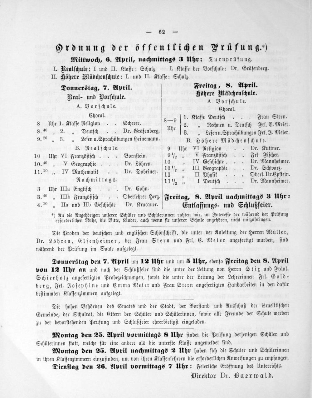 Die hohen Behörden des Staates und der Stadt, der Vorſtand und Ausſchuß der israelitiſchen Gemeinde, der Schulrat, die Eltern der Schüler und Schülerinnen, ſowie alle Freunde der Schule werden zu der bevorſtehenden Prüfung und Schlußfeier ehrerbietigſt eingeladen.