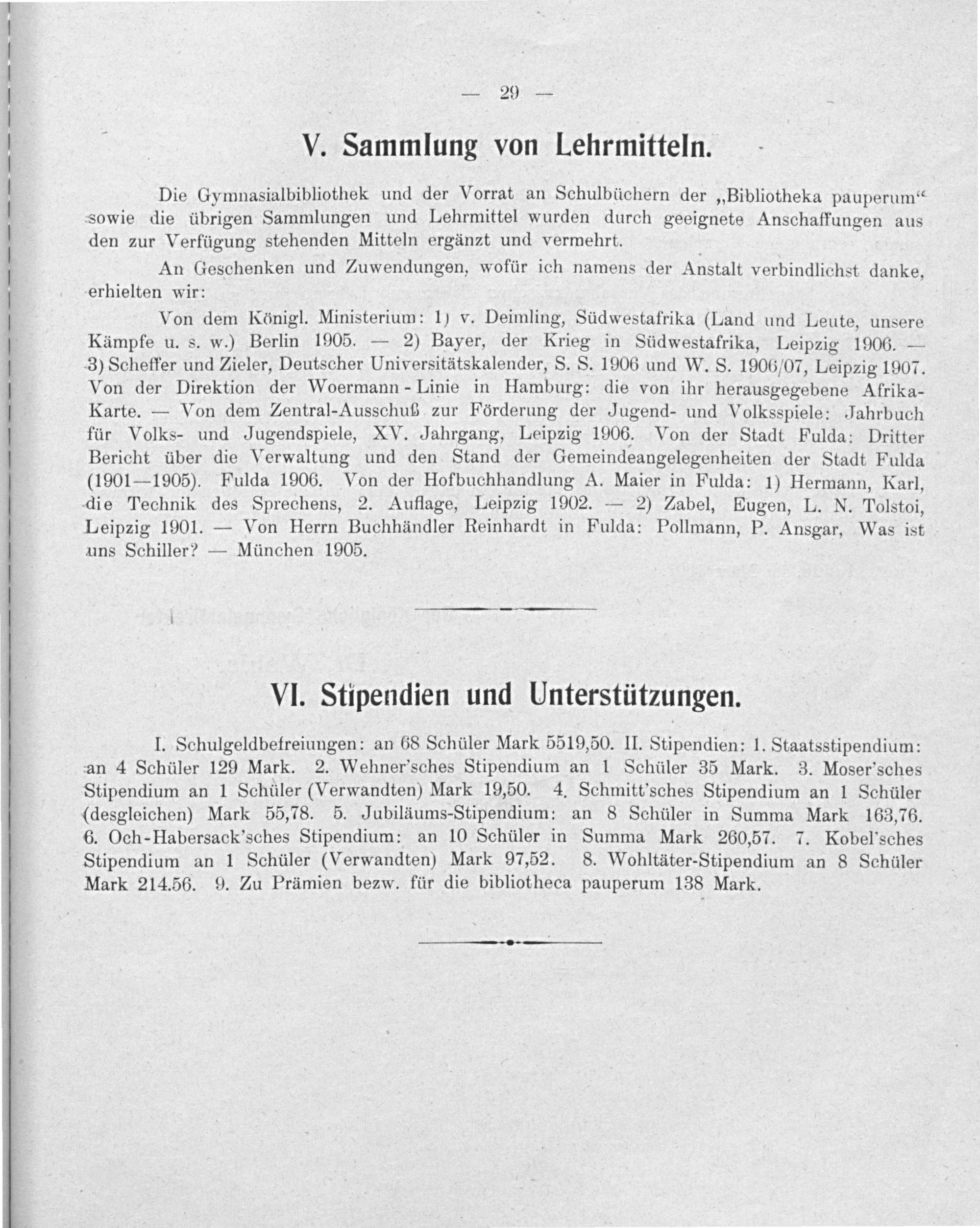Von dem Königl. Ministerium: 1) v. Deimling, Südwestafrika(Land und Leute, unsere Kämpfe u. s. w.) Berlin 1905.— 2) Bayer, der Krieg in Südwestafrika, Leipzig 1906.— 3) Scheffer und Zieler, Deutscher Universitätskalender, S. S. 1906 und W. S. 1906/07, Leipzig 1907. Von der Direktion der Woermann-Linie in Hamburg: die von ihr herausgegebene Afrika- Karte.— Von dem Zentral-Ausschuß zur Förderung der Jugend- und Volksspiele: Jahrbuch für Volks- und Jugendspiele, XV. Jahrgang, Leipzig 1906. Von der Stadt Fulda: Dritter Bericht über die Verwaltung und den Stand der Gemeindeangelegenheiten der Stadt Fulda (1901— 1905). Fulda 1906. Von der Hofbuchhandlung A. Maier in Fulda: 1) Hermann, Karl,