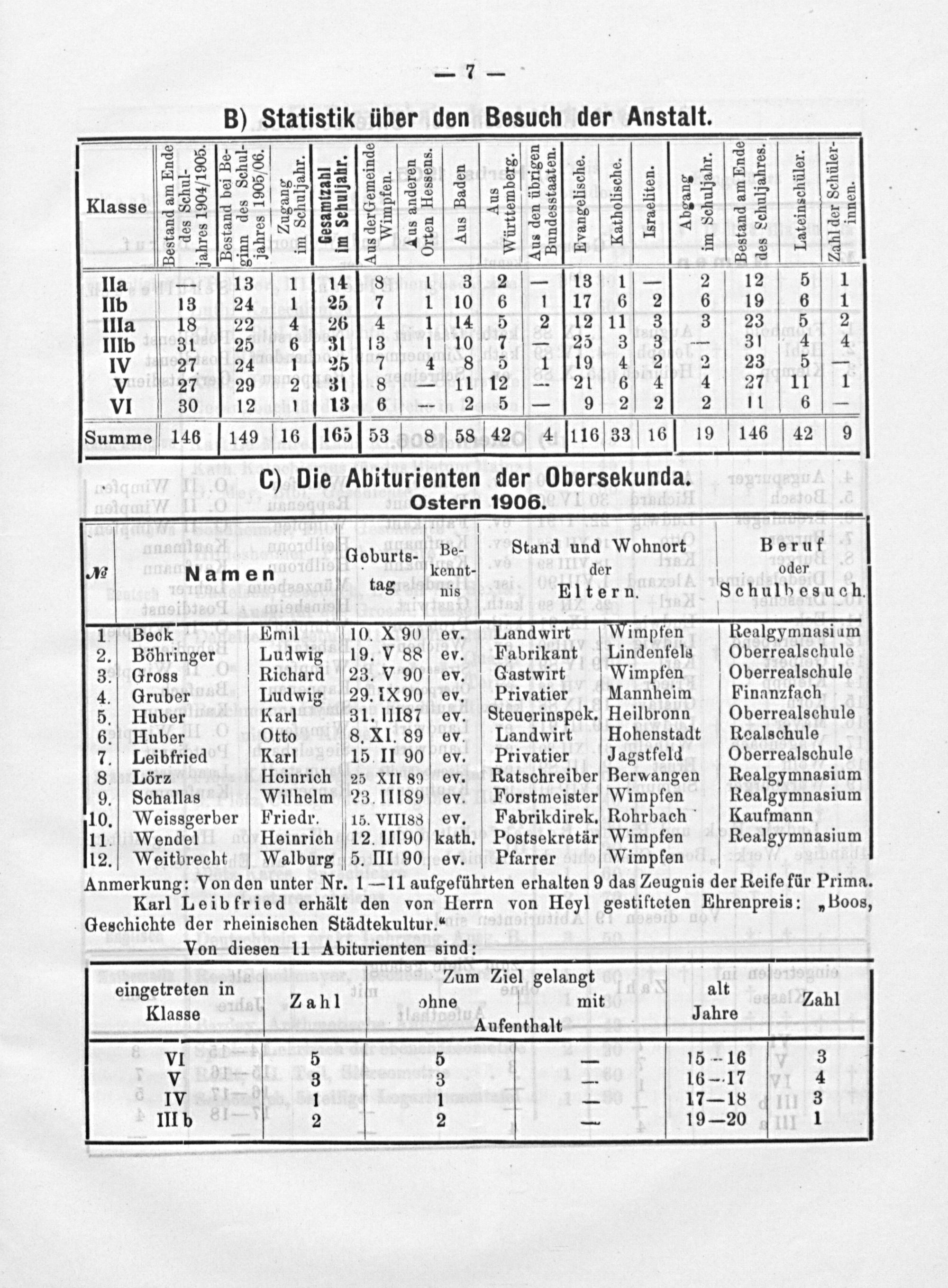 8 S[423S..[ 24 a..[8. 2 5228f[S=eeee Klasse 32SE 22 ,8,5EZSE. 3AS, e 22 222[5*222S5Sſaes Ss[225 S3 233 3[ 5ſSg2E32 4 AASNENNE 2 3 33 2 5 SS52SPEZae s=E25 A S38 2 SAS S Tini na ASA lla— 13 1 14 8 1 31/ 2[—[1s 1— 2 12 5 1 IIb 13 24 1 25 7 1 10 6 1[17 6 2 6 19 6 1 IIla 18 22 4 264 1l4. 5 2[12 11 3 3 23 5 2 IIlIb 31 25 6 31[13 1 10 7—[25 3 3— 31 4 4 IV 272 24 1 25 7 4 8 5 1[toſ 4 2 2 23 5 /— V 27 29 2 311 8—[1112—[29 6 4 4 27 111 VI 30 12[13 6— 21. 5— 1 921 2 2I. 2 1116— Summe] 146 149 16[16558 8 58 42 4[116 33 16] 19 146 42 9 C) Die Abiturienten der Obersekunda. Ostern 1906.— Geburte Be- Stund und Wohnort V Beruf NℳR Namen. kennt- der oder tag nis Eltern. Schulbesuch. 1 Beck Emil 10. X 90 ev. Landwirt Wimpfen Realgymnasium 2. Böhringer V Ludwig 19. V 88 ev. Fabrikant Lindenfels Oberrealschule 3. Gross Richard 23. V 90 ev. Gastwirt Wimpfen Oberrealschule 4. Gruber Ludwig 29. 1X 90 ev. Privatier Mannheim Finanzfach 5. Huber Karl 31. IIIS7 ev. Steuerinspek. Heilbronn Oberrealschule 6. Huber Otto 8. XI. 89 ev. Landwirt Hohenstadt Realschule 7. Leibfried Karl 15 II 90 ev. Privatier Jagstfeld Oberrealschule 8. Lörz Heinrich 25 XII 89 ev. Ratschreiber Berwangen Realgymnasium 9. Schallas Wilhelm(23. 1II89 ev. Forstmeister Wimpfen Realgymnasium 10. Weissgerber Friedr. 15. VIIISS ev. Fabrikdirek. Rohrbach Kaufmann 11. Wendel Heinrich 12. 1II90 kath. Postsekretär Wimpfen Realgymnasium 12. Weitbrecht Walburg 5. III 90 ev. Pfarrer Wimpfen