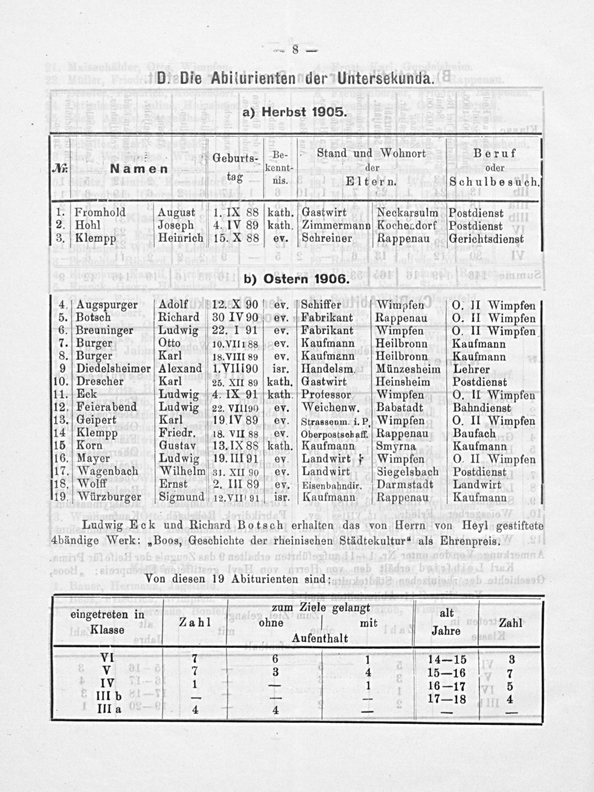 4. Augspurger Adolf 12. X 90 ev. Schiffer Wimpfen O. II Wimpfen 5. Botsch Richard 30 IV90 ev. Fabrikant Rappenau O. II Wimpfen 6. Breuninger Ludwig 22. 1 91 ev. Fabrikant Wimpfen O. II Wimpfen 7. Burger Otto V 10. VIIISS ev. Kaufmann Heilbronn Kaufmann 8. Burger Karl 1s. VIIIS9 ev. Kaufmann Heilbronn Kaufmann 9 Diedelsheimer Alexand 1. VIII90 isr. Handelsm. Münzesheim Lehrer 10. Drescher Karl 25. XII 89 kath. Gastwirt Heinsheim Postdienst 11. Eck Ludwig 4. IX 91 kath. Professor Wimpfen O. II Wimpfen 12, Feierabend Ludwig 22. VIII90 ev. Weichenw. Babstadt Bahndienst 13. Geipert Karl 19.IV 89 ev. Strassenm. i. P. Wimpfen O. II Wimpfen 14 Klempp Friedr. 18. VII SSs ev. Oberpostschaff. Rappenau Baufach 15 Korn Gustav 13.IX 88 kath. Kaufmann Smyrna Kaufmann 16. Mayer Ludwig 19. III91 ev. Landwirt y Wimpfen 0. II Wimpfen 17. Wagenbach Wilhelm 31. XII 90 mev. Landwirt Siegelsbach Postdienst 18. Wolff Ernst 2. III 89 ev. Eisenbahndir. Darmstadt Landwirt 19. Würzburger Sigmund 12. VII 91isr. Kaufmann Rappenau Kaufmann