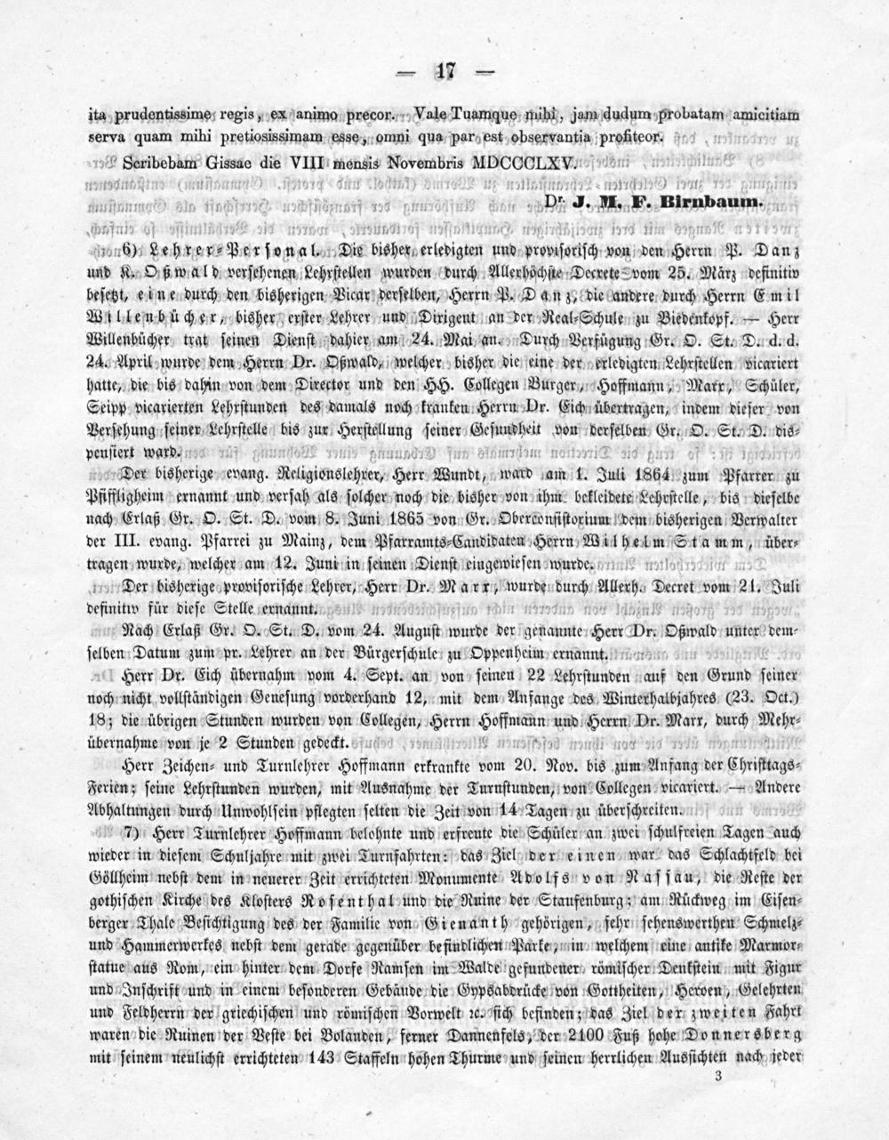 o6)- Hehrerserſonal. Die bisher, erueigen un propiſoriſch n von den Herm P. Dan und K. Oßwald verſehenen Lehrſtellen wurden durch Allerhöchſte Decrete Vvom 25. März definitiv beſetzt, eine durch den bisherigen Vicar derſelben, Herrn P. Dan z, die andere durch Herrn Emil Wüllenbücher, bisher erſter Lehrer und Dirigent an der Real⸗Schule zu Biedenkopf.— Herr Willenbücher trat ſeinen Dienſt dahier am 24. Mai an. Durch Verfügung Gr. O. St. D. d. d. 24. April wurde dem Herrn Dr. Oßwald, welcher bisher die eine der zerledigten Lehrſtellen vicariert hatte, die bis dahin von dem Director und den HH. Collegen Burger, Hoffmann, Marr, Schüler, Seipp vicarierten Lehrſtunden des damals noch kranken Herrn Dr. Eich übertragen, indem dieſer von Verſehung ſeiner Wehrſtelle bis zur Herſiallung ſoiner Beſenehel von peeſalbat Gr. O. St. D. dis⸗ penſteri ward.. f und 119