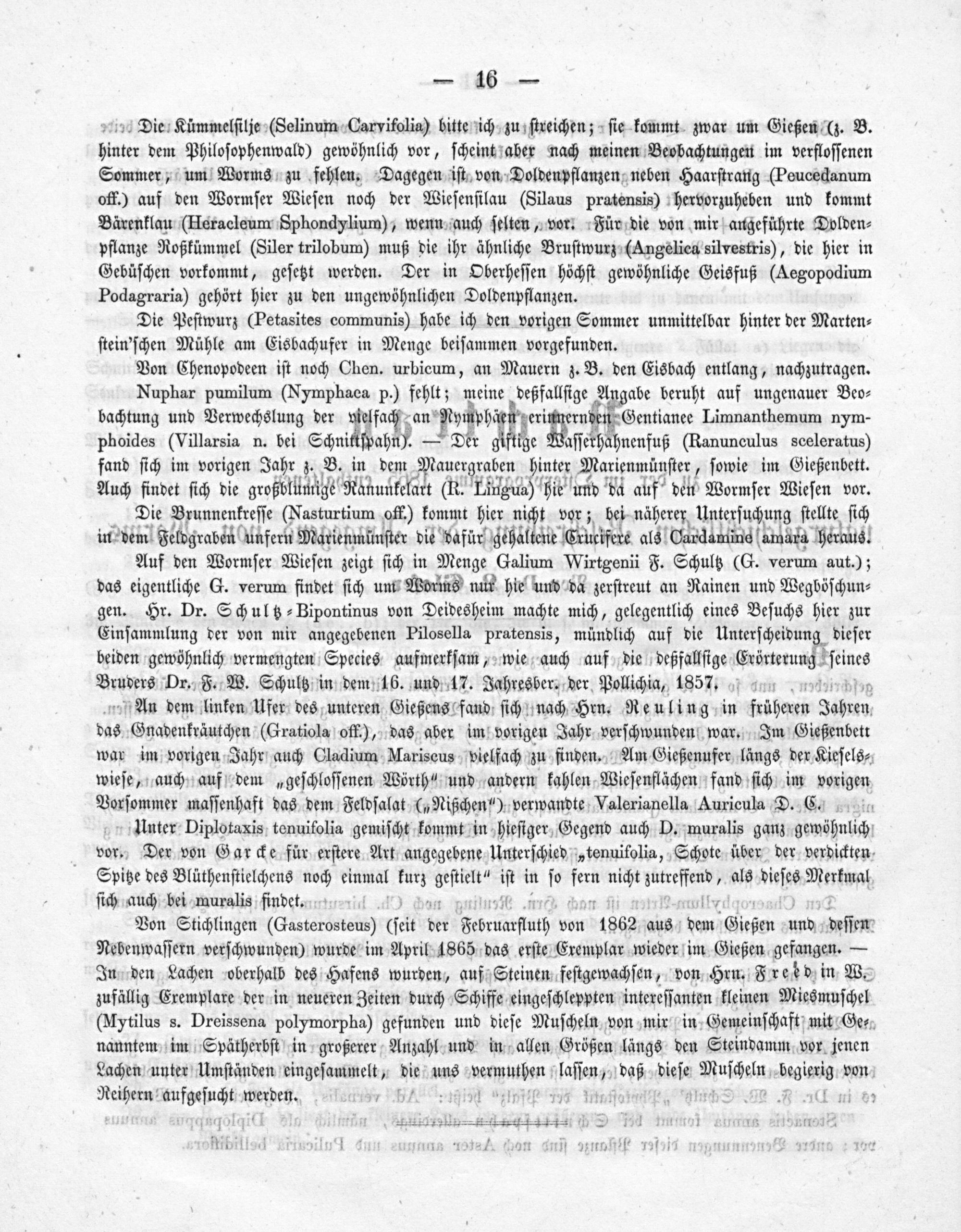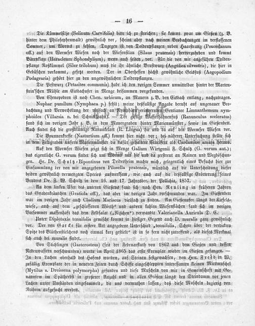 An dem linken Ufer des unteren Gießens fand ſich nach Hrn. Reuling in früheren Jahrem das s Gnadenkräutchen(Gratiola off.), das aber im vorigen Jahr verſchwunden war. Im Gießenbett war im vorigen Jahr auch Cladium Mariscus vielfach zu finden. Am Gießenufer längs der Kieſels⸗ wieſe, auch auf dem„geſchloſſenen Wörth“ und andern kahlen Wieſenflächen fand ſich im vorigen Vorſommer maſſenhaft das dem Feldſalat(„Nißchen“) verwandte Valerianella Auricula D. C.