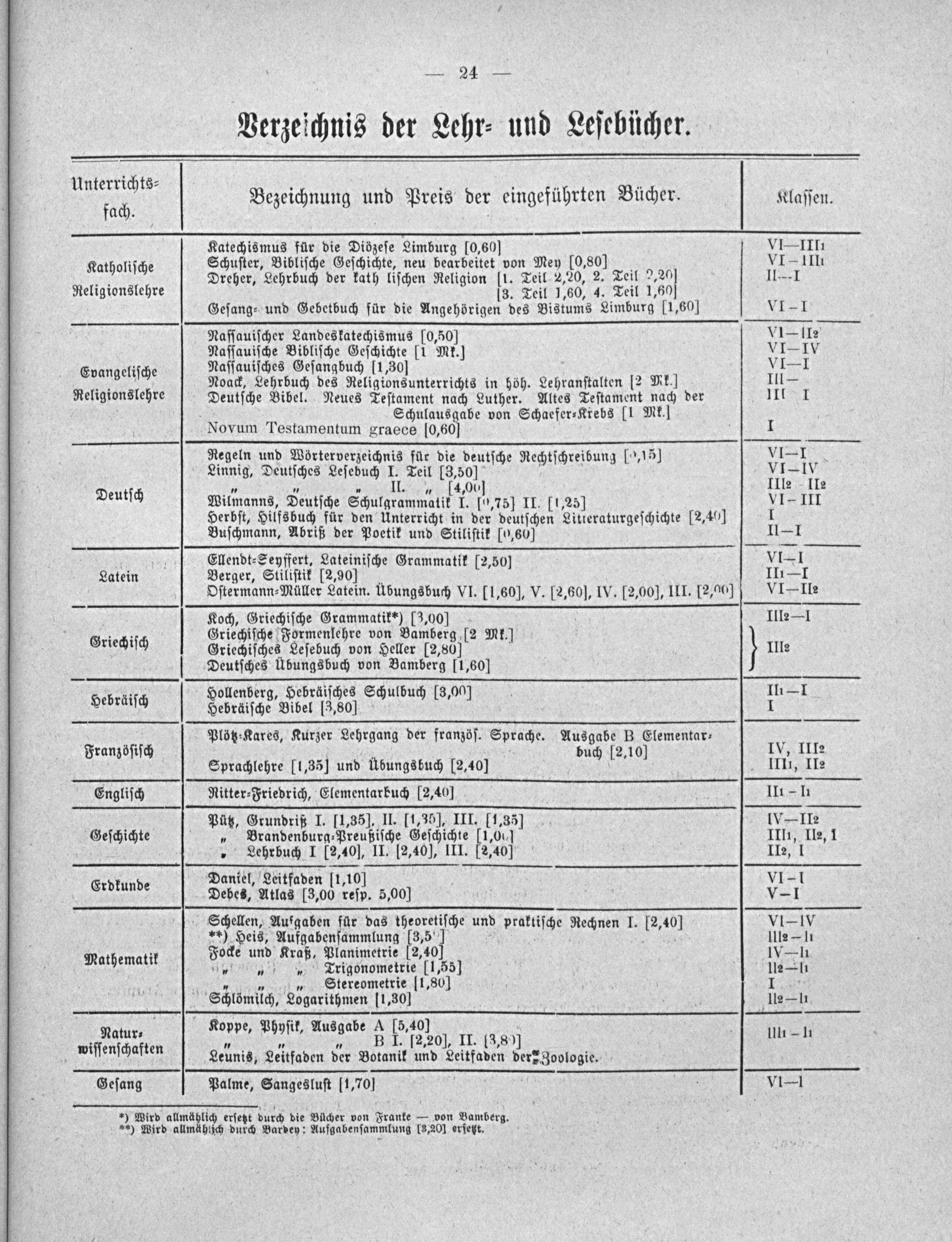 Unterrichts⸗ 7..„ fach Bezeichnung und Preis der eingeführten Bücher. Klaſſen. Katechismus für die Diözeſe Limburg[0,60] VI-IIII Katholiſche Schuſter, Bibliſche Geſchichte, neu bearbeitet von Mey[0,800 VI- IIII „ Dreher, Lehrbuch der kath liſchen Religion[1. Teil 2,20, 2. Teil 2,20 III Religionslehre 13. Teil 1,60, 4. Teil 1,60] Geſang⸗ und Gebetbuch für die Angehörigen des Bistums Limburg[1,60] VI=I Naſſauiſcher Landeskatechismus[0,50] vIS II Naſſauiſche Bibliſche Geſchichte[I Mk.] VIIV Evangeliſche Naſſauiſches Geſangbuch[1,30] VII Noack, Lehrbuch des Religionsunterrichts in höh. Lehranſtalten 12 Mk.] III— Religionslehre Deutſche Bibel. Neues Teſtament nach Luther. Altes Teſtament nach der 111 1 Schulausgabe von Schaefer⸗Krebs[1 Mk.] Novum Testamentum graece lo,60] 1 Regeln und Wörterverzeichnis für die deutſche Rechtſchreibung[0,15] vI Linnig, Deutſches Leſebuch I. Teil[3,50] 5 tic VI- lV Deutſch.„ 7„ II.„[4,00] IIle IIe Wilmanns, Deutſche Schulgrammatik I.[0,75] II.[1,25] VI= III Herbſt, Hilfsbuch für den Unterricht in der deutſchen Litteraturgeſchichte[2,40] 1 Buſchmann, Abriß der Poetik und Stiliſtik[0,60] I1— 1 Ellendt⸗Seyffert, Lateiniſche Grammatik[2,50] VI=I Latein Berger, Stiliſtik[2,90) II1= I Oſtermann⸗Müller Latein. Ubungsbuch VI.[1,60], V.[2,60]‧, IV.[2,00], III. 12,00]) VI= Ile Koch, Griechiſche Geemmait 3,901 IIl2—1 ,55; Griechiſche Formenlehre von Bamberg[2 Mk.] Griechiſch Griechiſches Leſebuch von Heller[2,80] III2 Deutſches Übungsbuch von Bamberg[1,60] 51 Hollenberg, Hebräiſches Schulbuch[3,00] IIi— I Hebräiſch Hebräiſche Bibel(3,80] 1 8 Plötz⸗Kares, Kurzer Lehrgang der franzöſ. Sprache. Ausgabe B Elementar⸗. Franzöſiſch buch[2,10] IV, IIIZ Sprachlehre[1,35] und Übungsbuch[2,40] IIII, II= Engliſch Ritter⸗Friedrich, Elementarbuch[2,40] III- I Pütz, Grundriß I. I1,35]. II.[1,35], III.[1,35] IV-= IIZ Geſchichte„ Brandenburg⸗Preußiſche Geſchichte[1,00% IIIi, II2, 1 „ Lehrbuch I[2,40], II.[2,40], III.[2,40] 1I2, I Daniel, Leitfaden[1,10] VI=I Erdkunde Debes, Atlas(3,00 reſp. 5,00] v Schhellen, Aufgaben fuͤr das theoretiſche und praktiſche Rechnen I.[2,40] VI=IV Syrdast Ruigabenſanmäung 8 8.- Ulle— li ; ocke und Kraß, Planimetrie[2,40 IV—l Mathematik„„„ Trigonometrie 1,55] Il2— li „„„ Stereometrie[1,80] I1. Schlömilch, Logarithmen 11,30] 112—1 Koppe, Phyſik, Ausgabe A[5,40] wiſenchten„„ B I.[2.20!, II. 13,8)] Ulr h . Leunis, Leitfaden der Botanik und Leitfaden der⸗ Zoologie. Geſang Palme, Sangesluſt[1,70] VI=I
