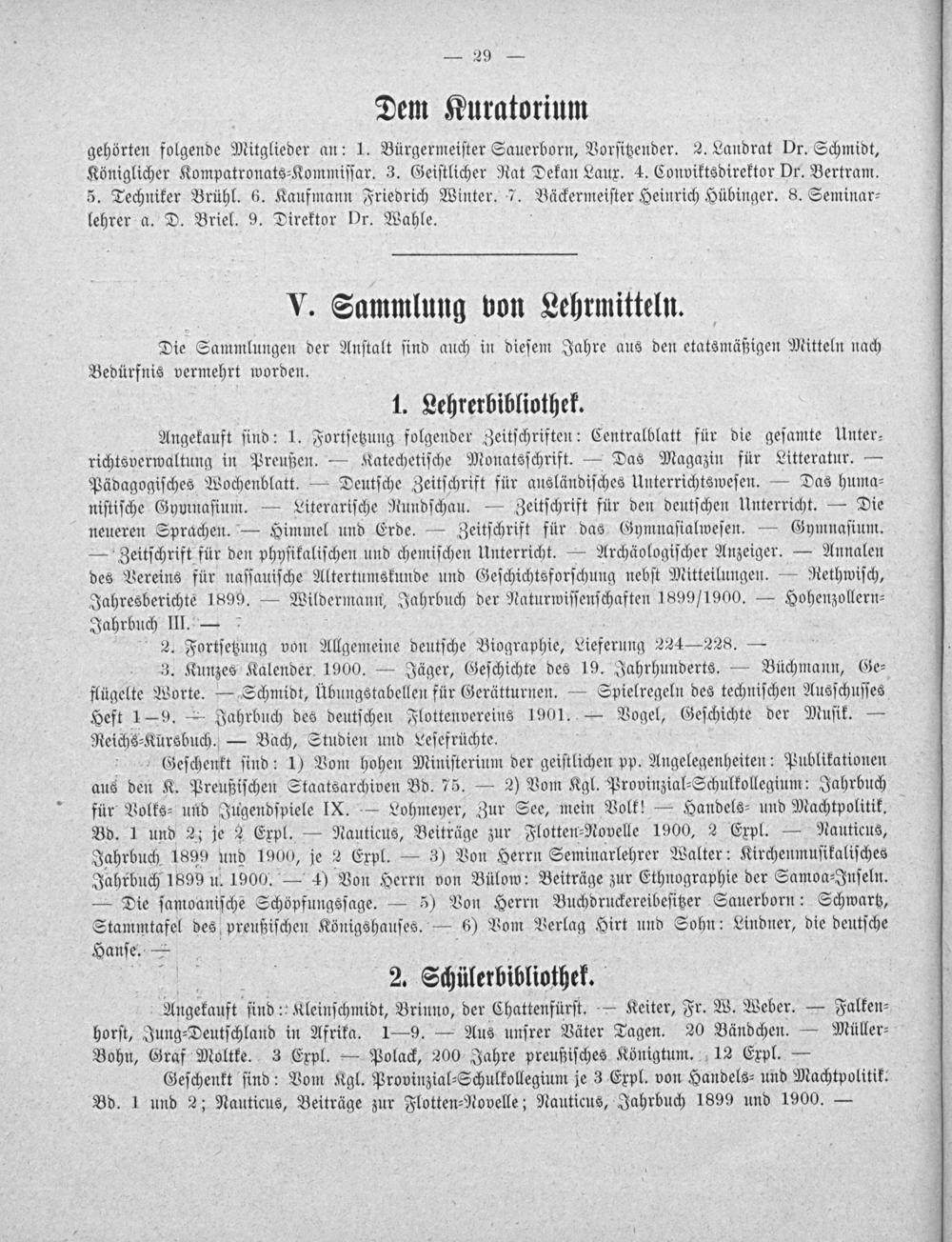 Geſchenkt ſind: 1) Vom hohen Miniſterium der geiſtlichen pp. Angelegenheiten: Publikationen aus den K. Preußiſchen Staatsarchiven Bd. 75.— 2) Vom Kgl. Provinzial⸗Schulkollegium: Jahrbuch für Volks⸗ und Jugendſpiele IX.— Lohmeyer, Zur See, mein Volk!— Handels⸗ und Machtpolitik. Bd. 1 und 2; je 2 Expl.— Nauticus, Beiträge zur Flotten⸗Novelle 1900, 2 Expl.— Nauticus, Jahrbuch 1899 und 1900, je 2 Expl.— 3) Von Herrn Seminarlehrer Walter: Kirchenmuſikaliſches Jahrbuch 1899 u. 1900.— 4) Von Herrn von Bülow: Beiträge zur Ethnographie der Samoa⸗Inſeln. — Die ſamoaniſche Schöpfungsſage.— 5) Von Herrn Buchdruckereibeſitzer Sauerborn: Schwartz, Stammtafel des preußiſchen Königshauſes.— 6) Vom Verlag Hirt und Sohn: Lindner, die deutſche