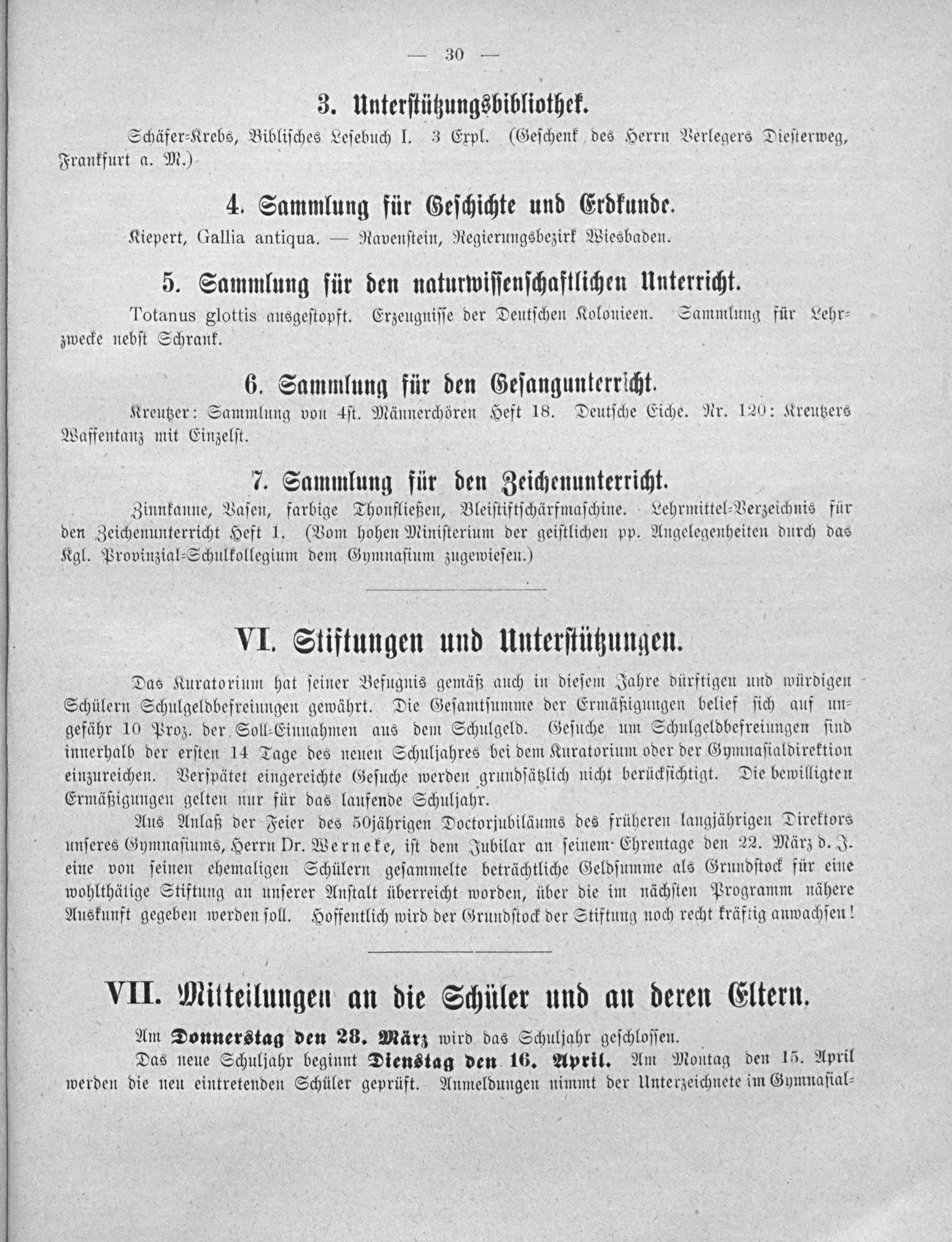 Aus Anlaß der Feier des 50jährigen Doctorjubiläums des früheren langjährigen Direktors unſeres Gymnaſiums, Herrn Dr. Werneke, iſt dem Jubilar an ſeinem Ehrentage den 22. März d. J. eine von ſeinen ehemaligen Schülern geſammelte beträchtliche Geldſumme als Grundſtock für eine wohlthätige Stiftung an unſerer Anſtalt überreicht worden, über die im nächſten Programm nähere Auskunft gegeben werden ſoll. Hoffentlich wird der Grundſtock der Stiftung noch recht kräftig anwachſen!