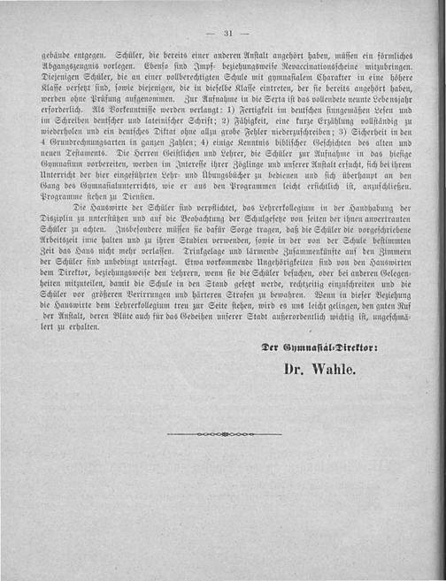 gebäude entgegen. Schüler, die bereits einer anderen Anſtalt angehört haben, müſſen ein förmliches Abgangszeugnis vorlegen. Ebenſo ſind Impf⸗ beziehungsweiſe Revaccinationsſcheine mitzubringen. Diejenigen Schüler, die an einer vollberechtigten Schule mit gymnaſialem Charakter in eine höhere Klaſſe verſetzt ſind, ſowie diejenigen, die in dieſelbe Klaſſe eintreten, der ſie bereits angehört haben, werden ohne Prüfung aufgenommen. Zur Aufnahme in die Sexta iſt das vollendete neunte Lebensjahr erforderlich. Als Vorkenntniſſe werden verlangt: 1) Fertigkeit im deutſchen ſinngemäßen Leſen und im Schreiben deutſcher und lateiniſcher Schrift; 2) Fähigkeit, eine kurze Erzählung vollſtändig zu wiederholen und ein deutſches Diktat ohne allzu grobe Fehler niederzuſchreiben; 3) Sicherheit in den 4 Grundrechnungsarten in ganzen Zahlen; 4) einige Kenntnis bibliſcher Geſchichten des alten und neuen Teſtaments. Die Herren Geiſtlichen und Lehrer, die Schüler zur Aufnahme in das hieſige Gymnaſium vorbereiten, werden im Intereſſe ihrer Zöglinge und unſerer Anſtalt erſucht, ſich bei ihrem Unterricht der hier eingeführten Lehr⸗ und Übungsbücher zu bedienen und ſich überhaupt an den Gang des Gymnaſialunterrichts, wie er aus den Programmen leicht erſichtlich iſt, anzuſchließen. Programme ſtehen zu Dienſten.