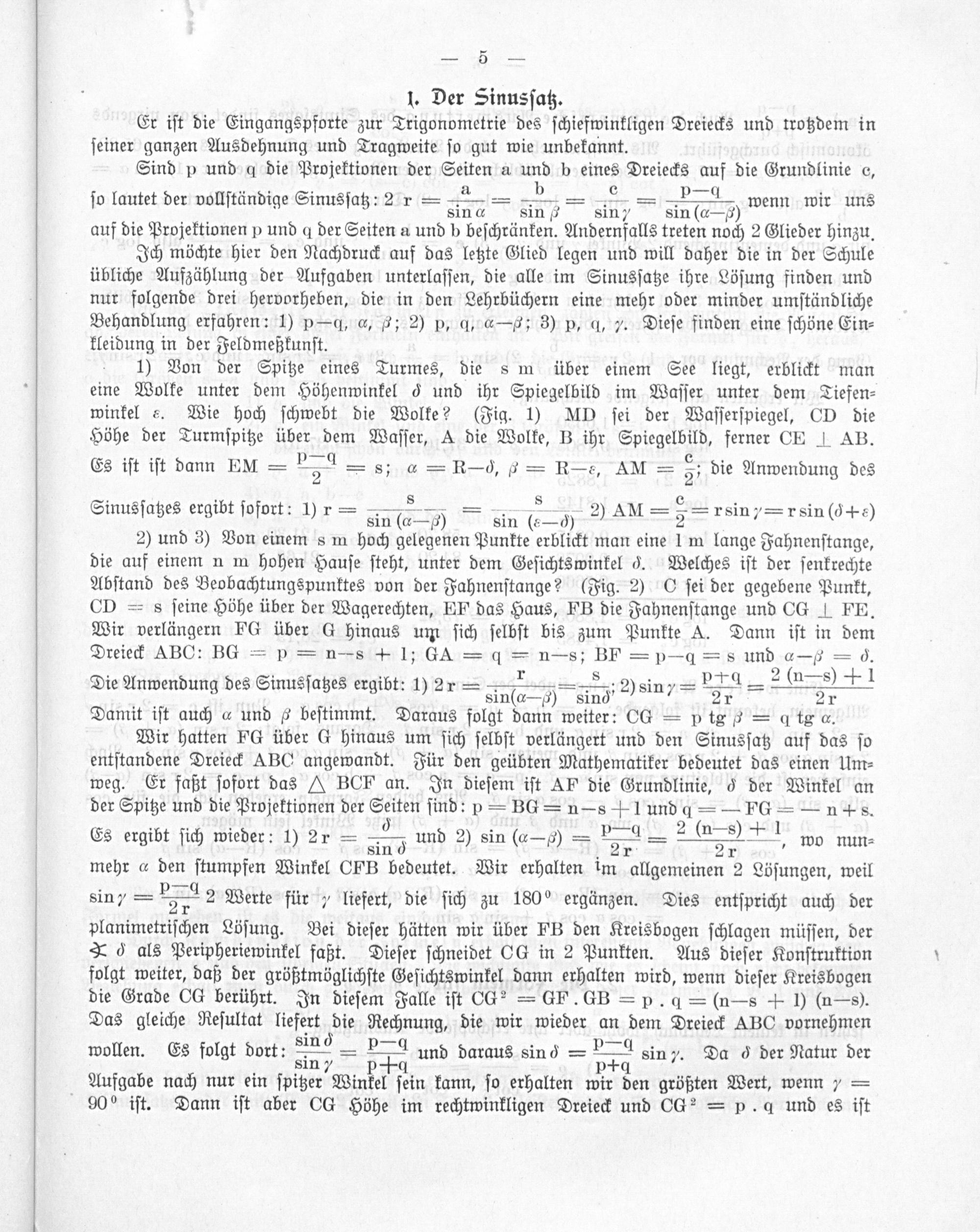 Ich möchte hier den Nachdruck auf das letzte Glied legen und will daher die in der Schule übliche Aufzählung der Aufgaben unterlaſſen, die alle im Sinusſatze ihre Löſung finden und nur folgende drei hervorheben, die in den Lehrbüchern eine mehr oder minder umſtändliche Behandlung erfahren: 1) p—q, a,„; 2) p,—, ‧— 9; 3) p, a, y. Dieſe finden eine ſchöne Ein⸗ kleidung in der Feldmeßkunſt.