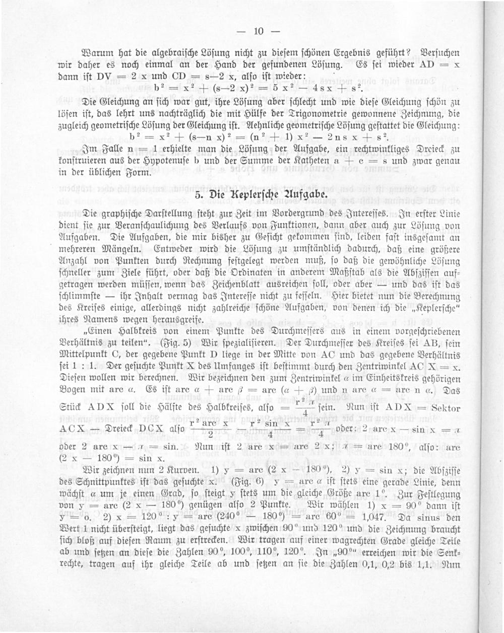 „Einen Halbkreis von einem Punkte des Durchmeſſers aus in einem vorgeſchriebenen Verhältnis zu teilen“.(Fig. 5) Wir ſpezialiſieren. Der Durchmeſſer des Kreiſes ſei AB, ſein Mittelpunkt C, der gegebene Punkt D liege in der Mitte von AC und das gegebene Verhältnis ſei 1: 1. Der geſuchte Punkt X des Umfanges iſt beſtimmt durch den Zentriwinkel AC X= x. Dieſen wollen wir berechnen. Wir bezeichnen den zum Zentriwinkel«im Einheitskreis gehörigen Bogen mit arc a. Es iſt arc«+ arc= arc(a+ 9) und n arc= arc n d. Das