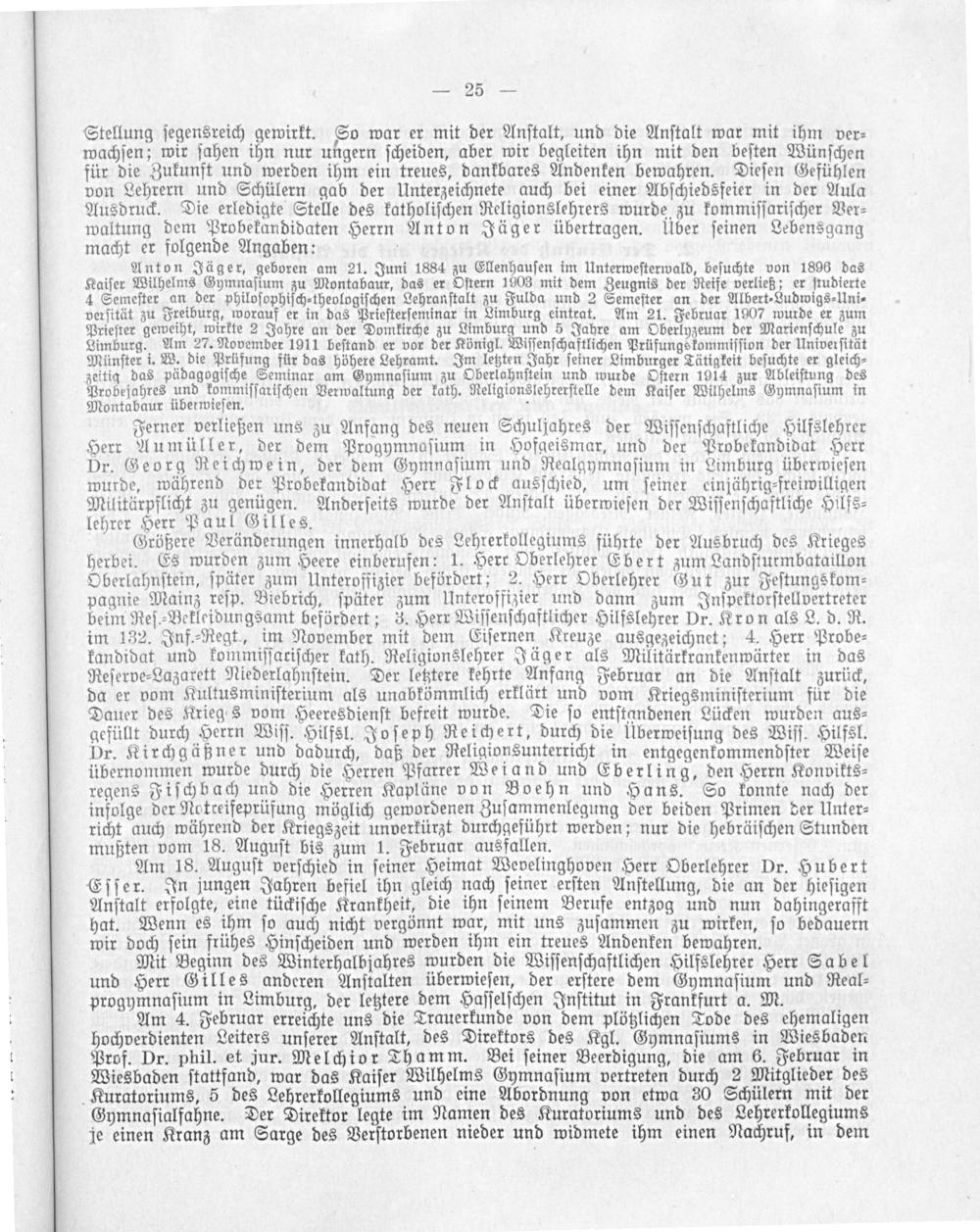 Anton Jäger, geboren am 21. Juni 1884 zu Ellenhauſen im Unterweſterwald, beſuchte von 1896 das Kaiſer Wilhelms Gymnaſium zu Montabaur, das er Oſtern 1903 mit dem Zeugnis der Reife verließ; er ſtudierte 4 Semeſter an der philoſophiſch⸗theologiſchen Lehranſtalt zu Fulda und 2 Semeſter an der Albert⸗Ludwigs⸗Uni⸗ verſität zu Freiburg, worauf er in das Prieſterſeminar in Limburg eintrat. Am 21. Februar 1907 wurde er zum Prieſter geweiht, wirkte 2 Jahre an der Domkirche zu Limburg und 5 Jahre am Oberlyzeum der Marienſchule zu Limburg. Am 27. November 1911 beſtand er vor der Königl. Wiſſenſchaftlichen Prüfungskommiſſion der Univerſität Münſter i. W. die Prüfung für das höhere Lehramt. Im letzten Jahr ſeiner Limburger Tätigkeit beſuchte er gleich⸗ zeitig das pädagogiſche Seminar am Gymnaſium zu Oberlahnſtein und wurde Oſtern 1914 zur Ableiſtung des Probejahres und kommiſſariſchen Verwaltung der kath. Religionslehrerſtelle dem Kaiſer Wilhelms Gymnaſium in