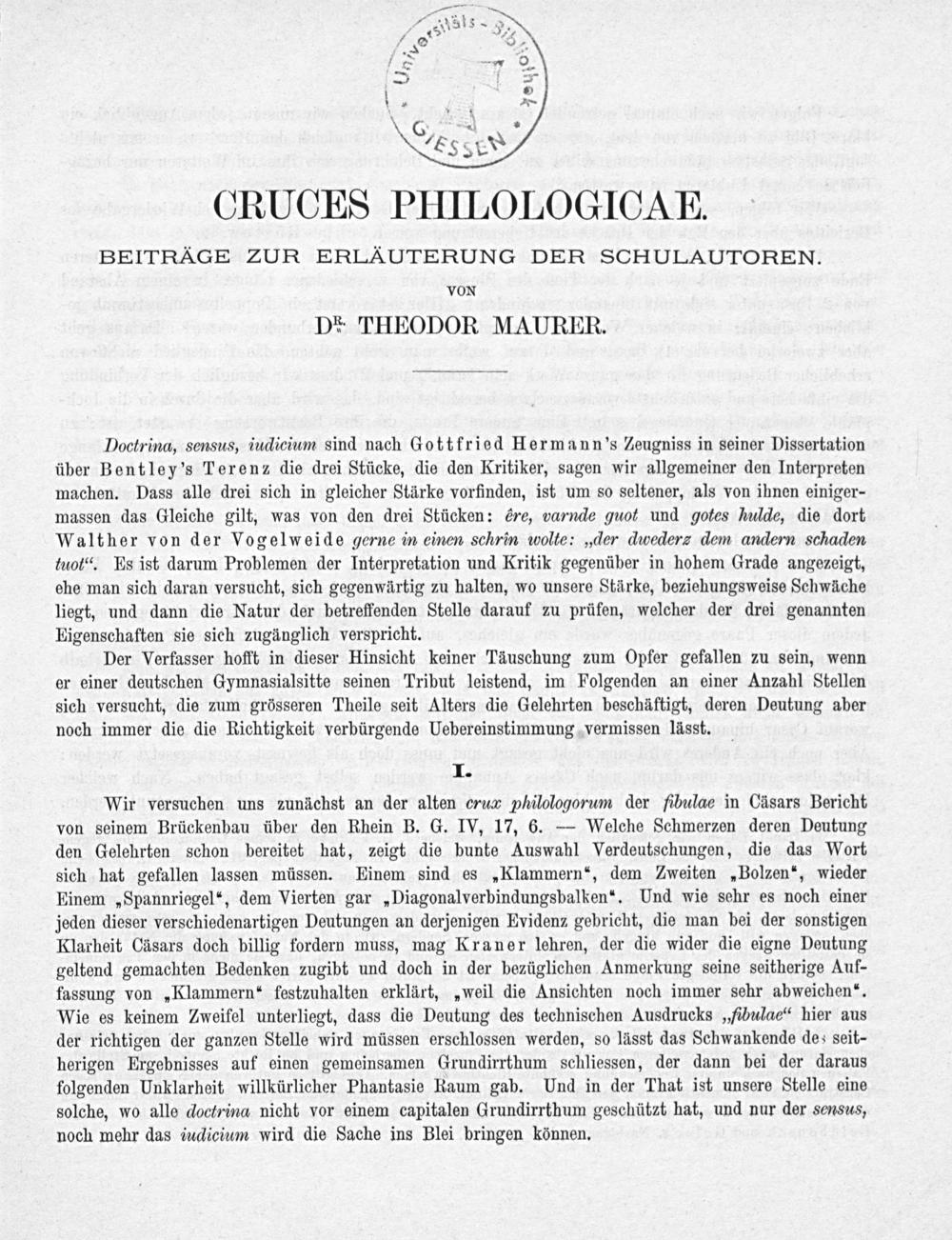 Doctrina, sensus, iudlicium sind nach Gottfried Hermann's Zeugniss in seiner Dissertation über Bentley's Terenz die drei Stücke, die den Kritiker, sagen wir allgemeiner den Interpreten machen. Dass alle drei sich in gleicher Stärke vorfinden, ist um so seltener, als von ihnen einiger- massen das Gleiche gilt, was von den drei Stücken: ére, varnde guot und gotes hulde, die dort Walther von der Vogelweide gerne in einen schrin wolte:„der davederz dem andern schaden kuot“. Es ist darum Problemen der Interpretation und Kritik gegenüber in hohem Grade angezeigt, ehe man sich daran versucht, sich gegenwärtig zu halten, wo unsere Stärke, beziehungsweise Schwäche liegt, und dann die Natur der betreffenden Stelle darauf zu prüfen, welcher der drei genannten Eigenschaften sie sich zugänglich verspricht.
