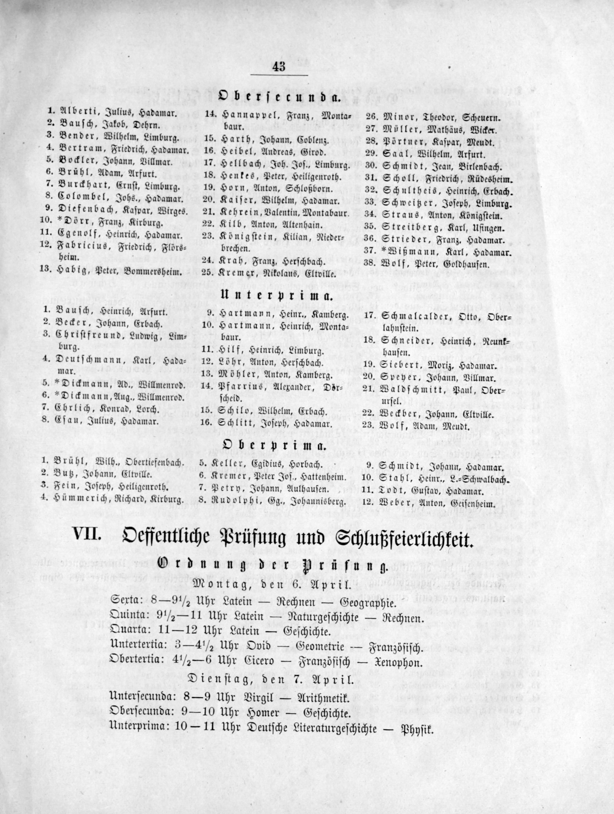 Bender, Wilhelm, Limburg. .Bertram, Friedrich, Hadamar. . Bockler, Johann, Villmar. Brühl, Adam, Arfurt.